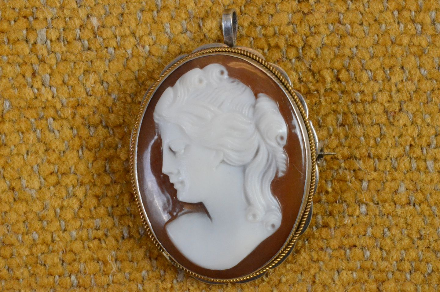Camé yndigt kvinde hoved udskåret af konkylie, monteret i i rundtakket sølvramme. Smykket er både en broche og et vedhæng. Str.: 3,5 * 2,5 cm. Art No. 47