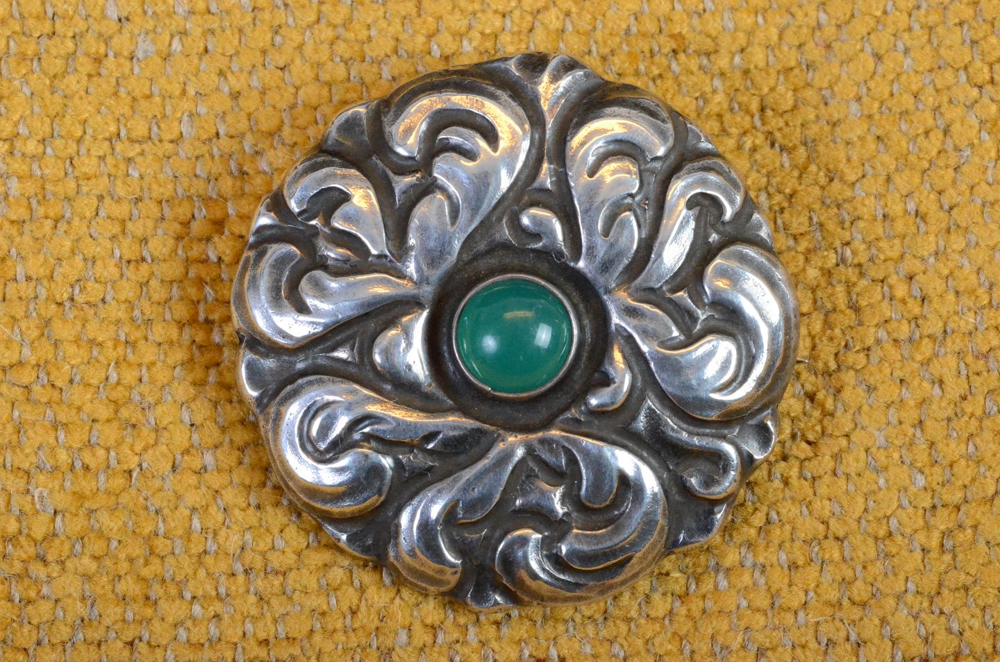Broche Art Nouveau silver closed back, decorated with green agate. Stamped 830S "ECW". Diameter 4 cm. Art No .: 38