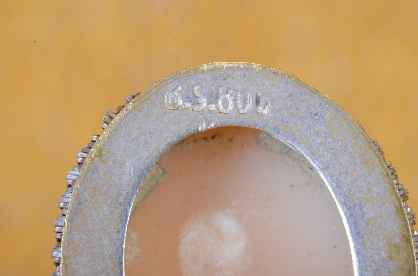 Camé mini vedhæng med damehoved skåret af konkylie, monteret i sølvramme fint dekoreret kant og omgivet af snoet bånd.