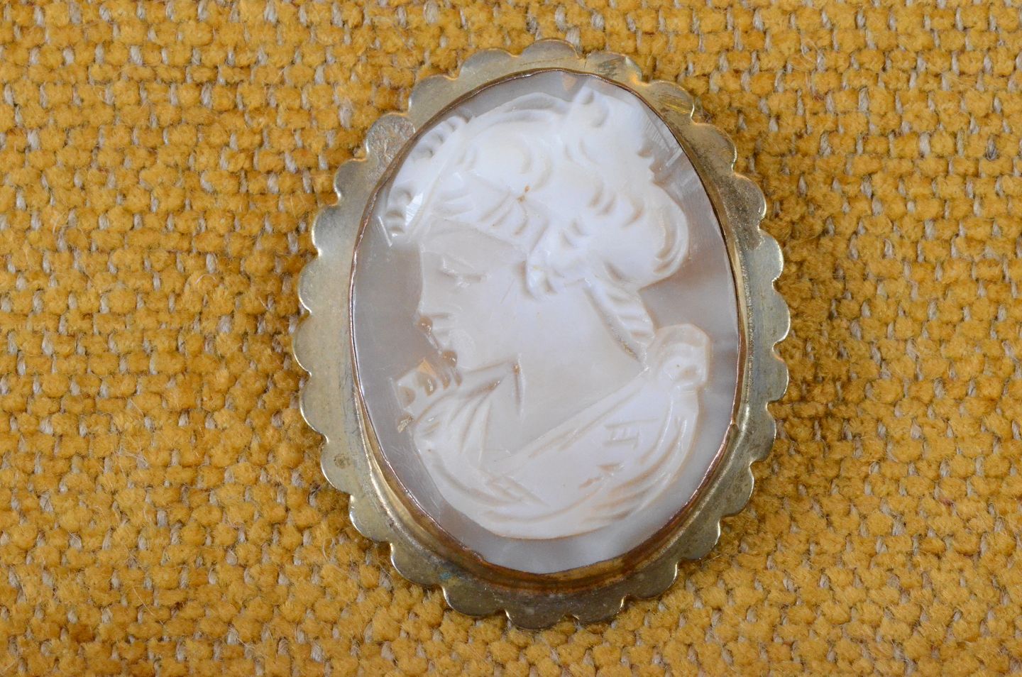 Camé dame hoved skåret af lys konkylie i rundtakket ramme af forgyldt sølv. Monteret som broche og vedhæng. Stemplet 800. Str.: 4*3,5 cm. Art no. 48