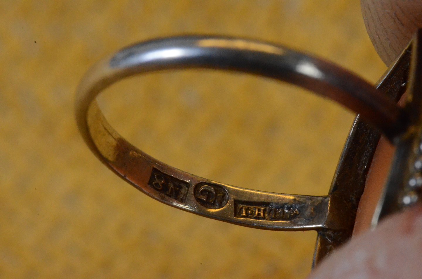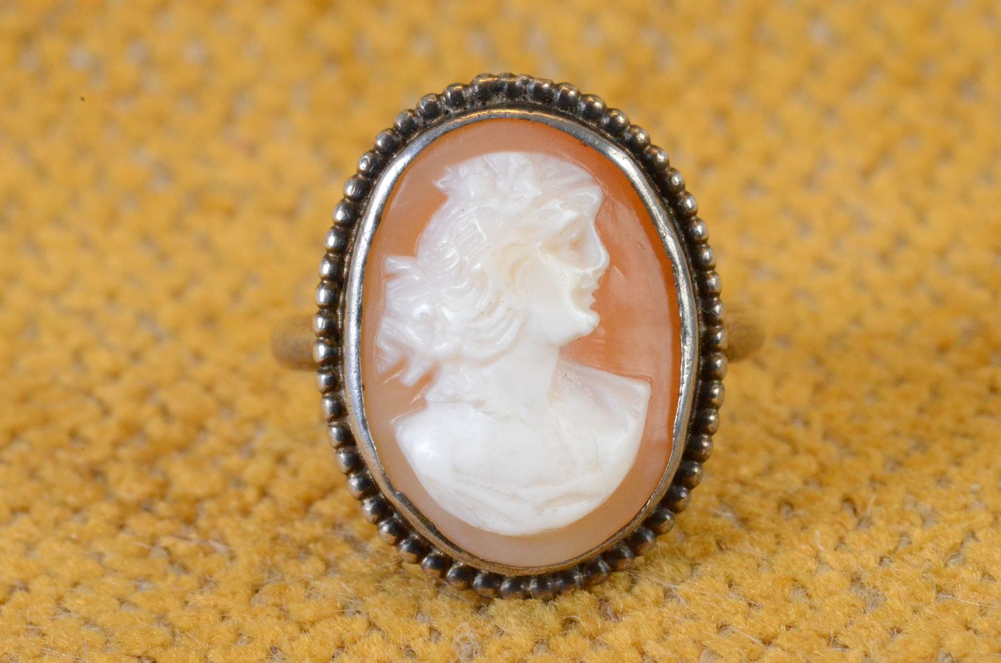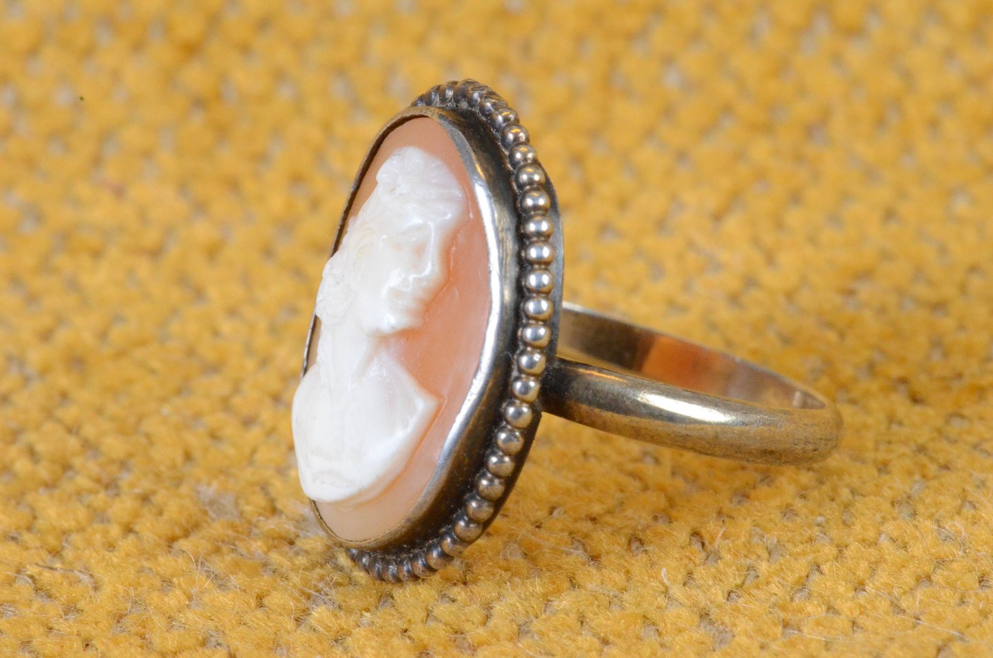 Camé ring af sølv med damehoved skåret af konkylie, monteret i sølvramme omkranset af perlekant. Str.: lille Art No. 52