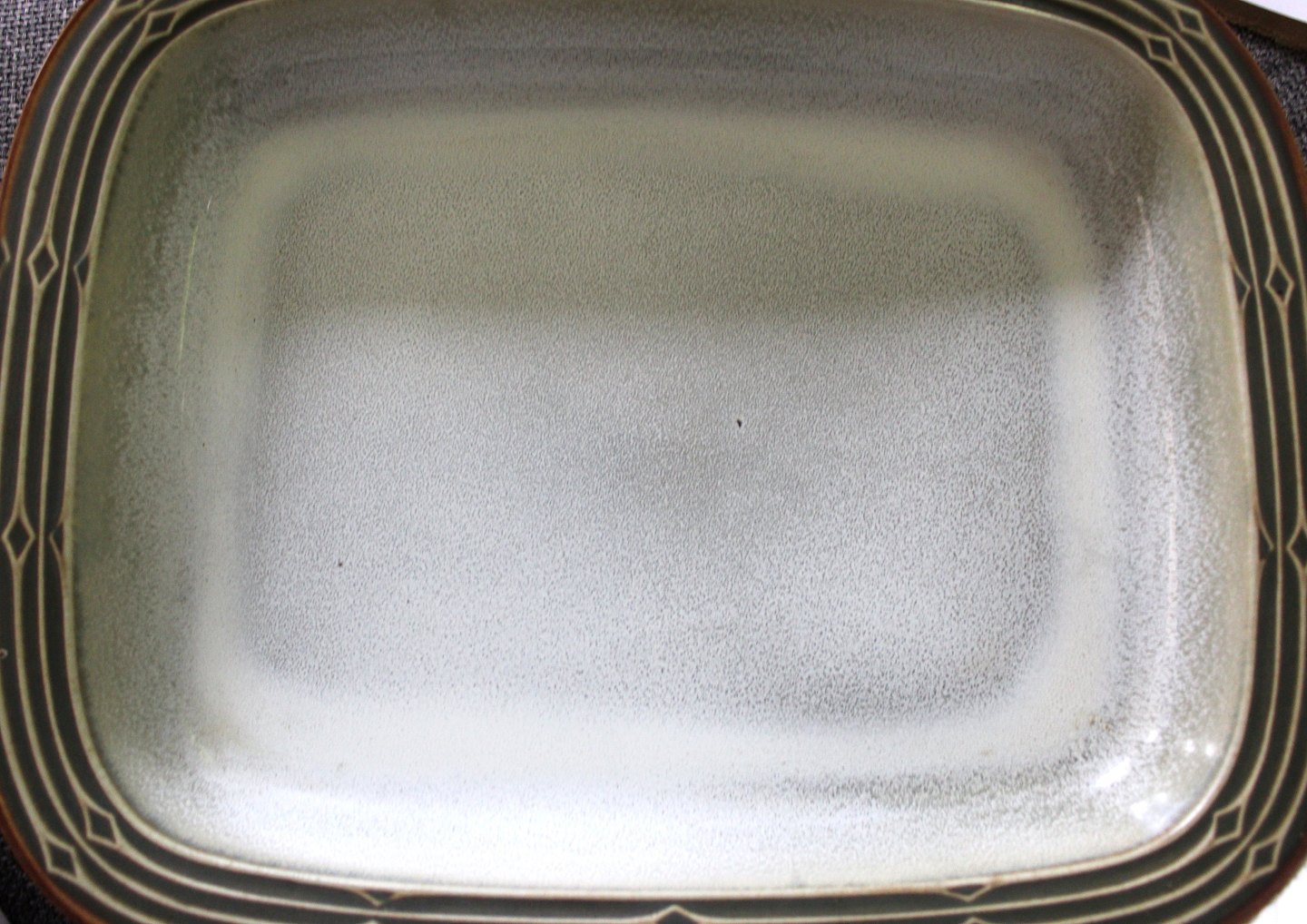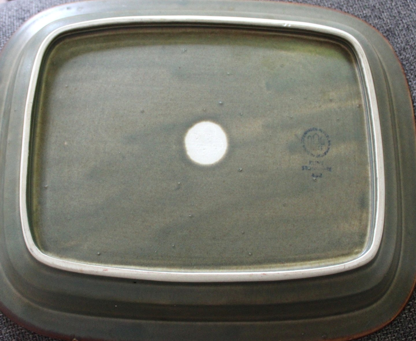 Text available in Danish: Bing & Grøndahl og Nissen, Rune designet af Anders og Jens H Quistgaard 1969. Dybt fad. Længde 32,5 cm. Bredde 27 cm. Højde 4,5 cm. II. sortering med brændingsplet indvendig. Pris: 375 kr. Lager: 1