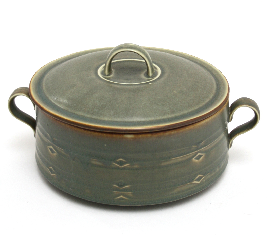Text available in Danish: Bing & Grøndahl og Nissen, Rune designet af Anders og Jens H Quistgaard 1969. Terrin med låg nr. 512. Diameter 19 cm (uden ører). Højde med låg 12 cm. Pris: 475 kr. stk. Lager: 1