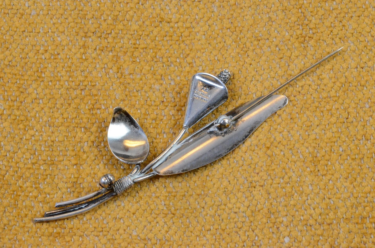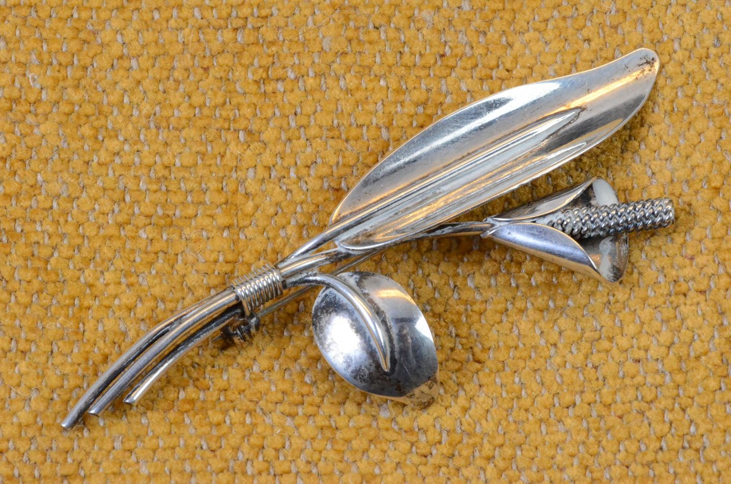 Sølv broche udformet som Kala blomst med aflangt støvfanger og blad. Stemplet "AG" Sterling. Str.: 8*2,5 cm. Art No. 61