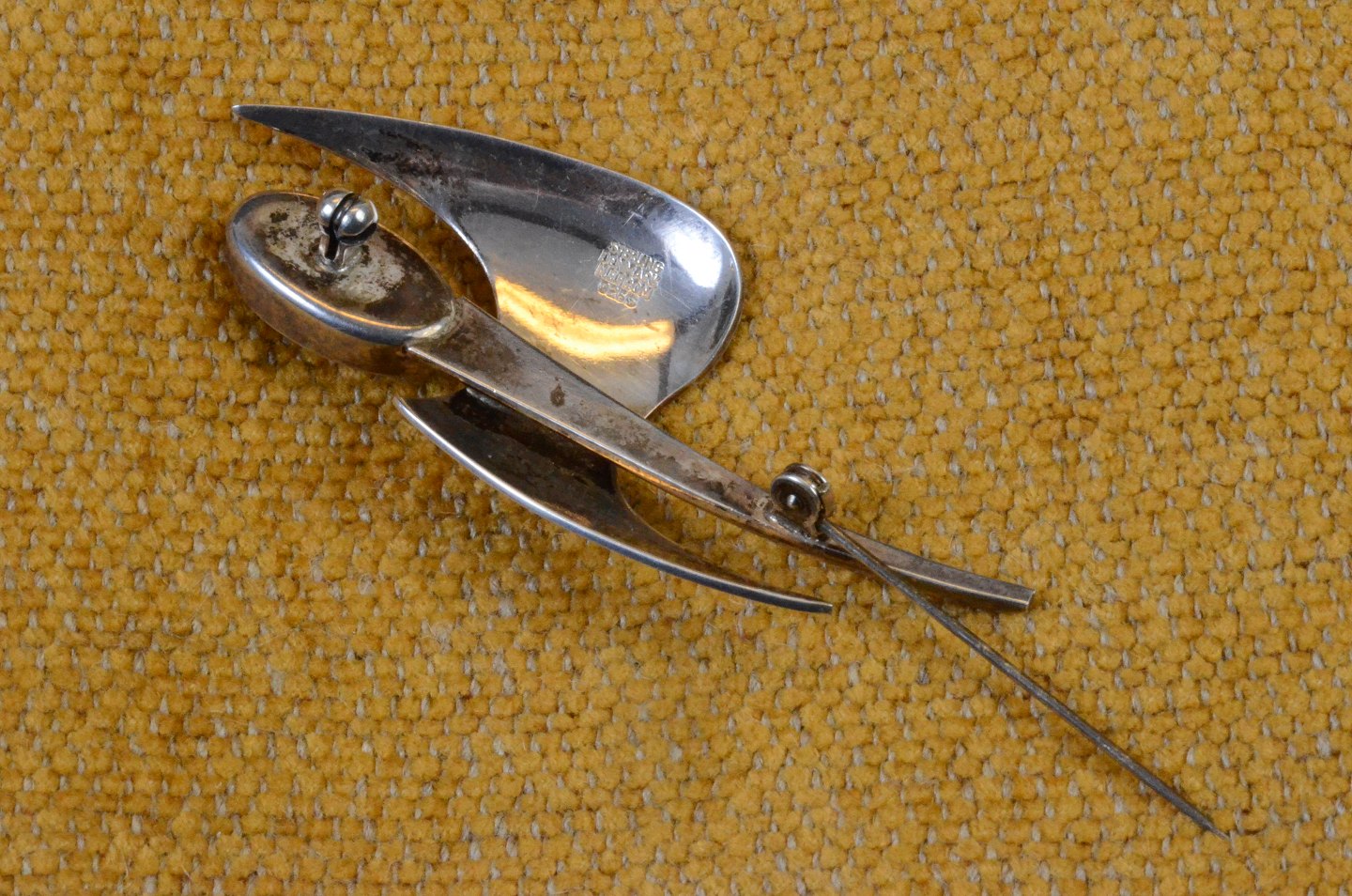Broche af sølv formet som skematisk engel med hoved af rav. Stemplet N.E.From Sterling Denmark. Str.: 7*2,5cm. Art No.72