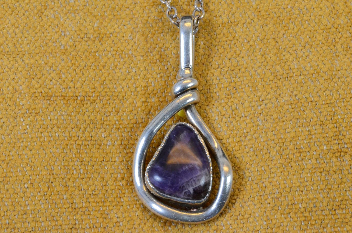 Vedhæng med ametyst 1970'erne i sølvkæde. Unika af Hans Henning ustemplet. Str.: vedhæng 7*3,5 cm , kæde 40 cm. Art No. 76