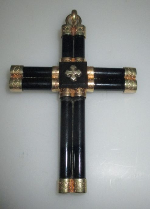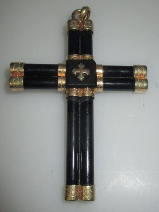 Antikt Kors vedhæng, 19. årh. Forgyldt sølv og poleret Hæmatit. 9,5 x 6 cm.