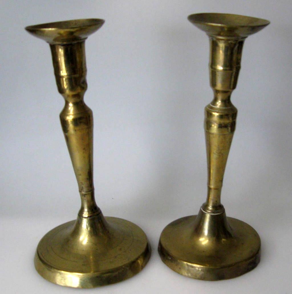 Par antikke danske empire stager i messing, 19. årh. Rund fod med profileret stamme. Den ene fod med dekorationer. Den anden har fået skiftet foden ud med en anden mindre - gammel reparation. H: 18,5 - 19 cm.