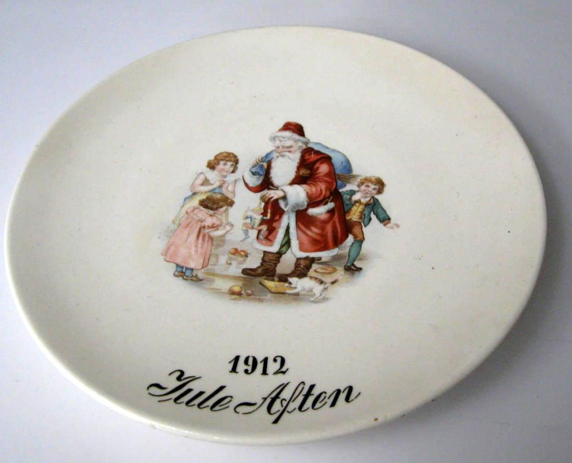 Tallerken, juleaften 1912, med julemand, der deler gaver ud. Tyskland. Fajance. Dekoration i overføringsteknik. Under bunden produktionsnummer: 972 og stemplet: 20G4. Dia.: 20,5 cm.