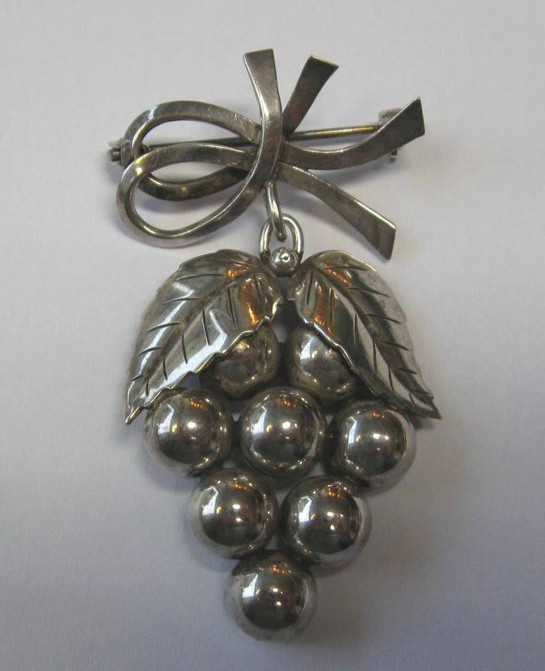 Brosche i sølv som vindrueklase med sløjfe. Stemplet.: 830 s. Denmark, John L for sølvsmed John Lauritzen, København fra 1955 -. L. 5 cm.