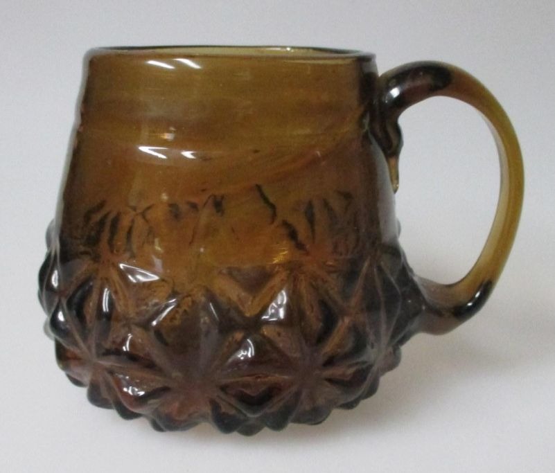 Virkelig sjældent ølkrus - hanke glas - antagelig Danmark. 19. årh. Brun- grøn glasmasse. Med påsat hank. H.: 8,5 cm.