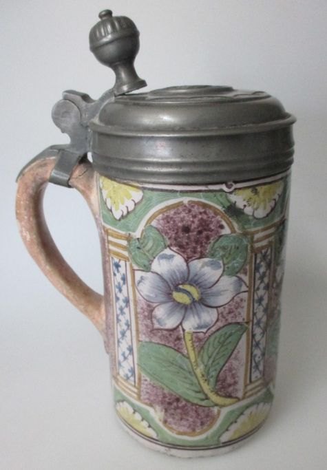 Tysk signeret fajance øl krus, 18. årh. Med tin låg.