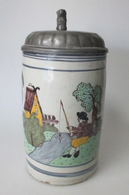 Grå skærv med håndmalet polykrom dekoration af fiskende mand. Højde.: 19 cm. Barokt tinlåg med indvendig stempel: 1749.