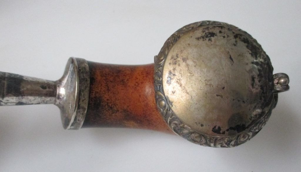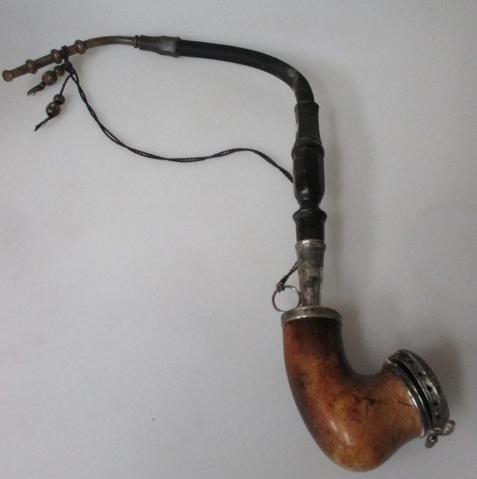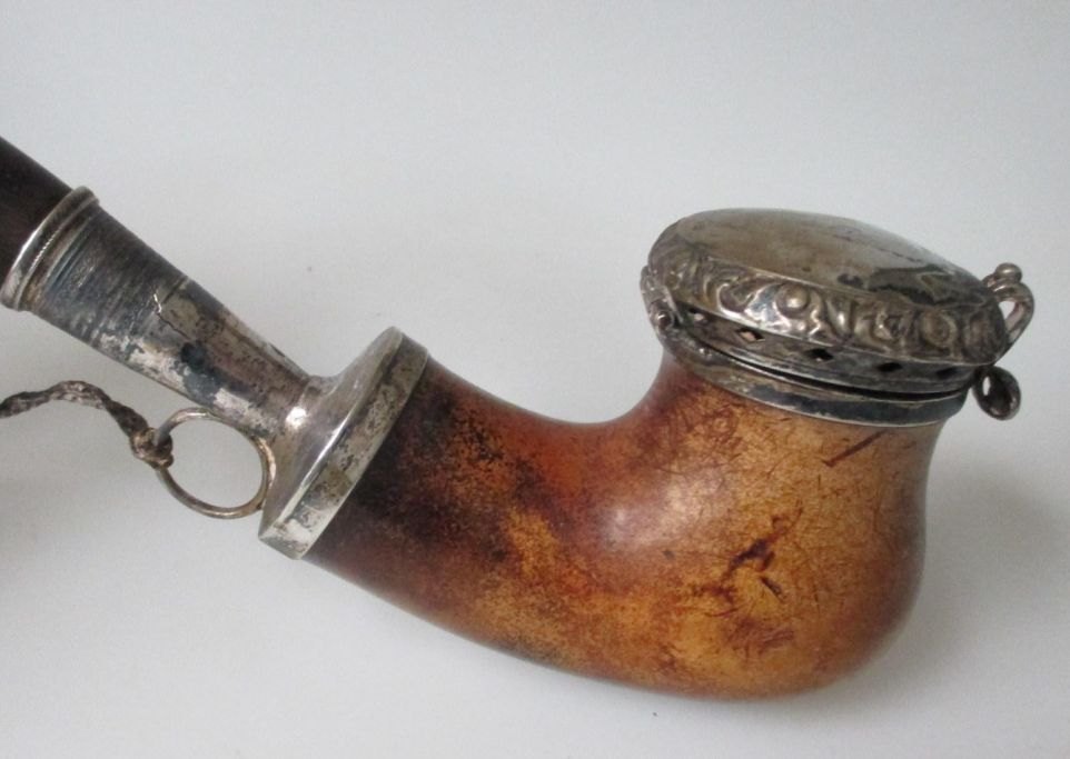 Dansk merskums pibe, 19. årh. Længde.: 43 cm. Med forsølvet låg.