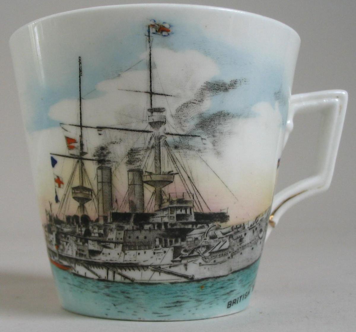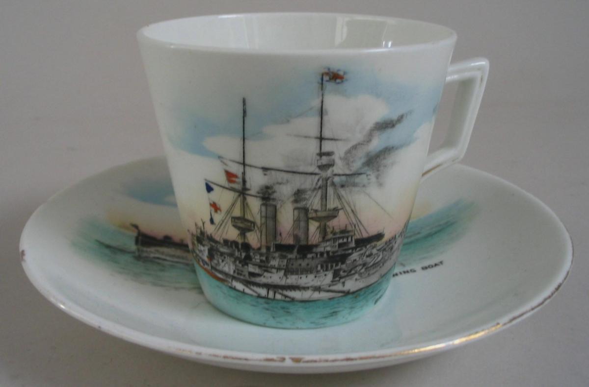 Engelsk kop i hvidt porcelæn med underkop, o. 1900, stemplet: Shelley China, England, med motiver i overføringsteknik af "British Battleship" på kop og " A british Mining Boat" på underkop. Polykrom bemaling og emalje. Med guld på kanter. Højde kop.: 7 cm. Dia. underkop.: 14 cm.