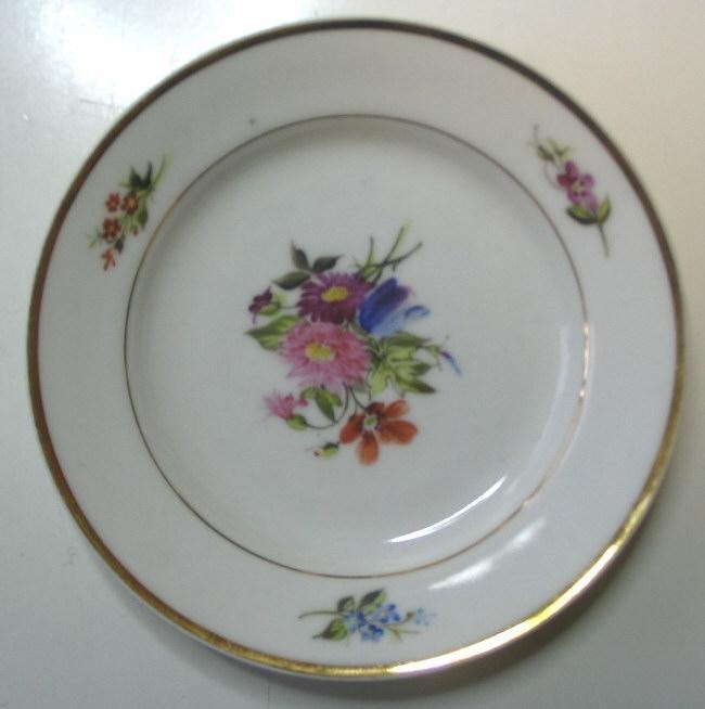Sidetallerkener, Bing & Grøndahl, o. 1880, dekoreret med blomster og guldkanter. Stemplet.: B&G. Dia.: 14 cm.
