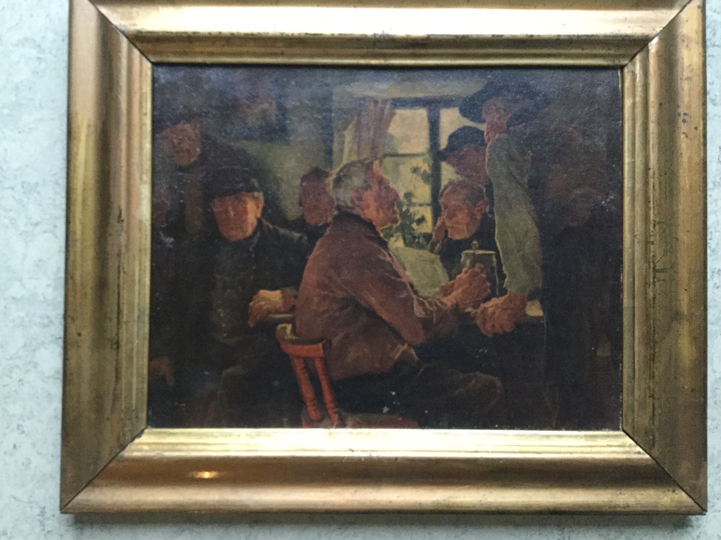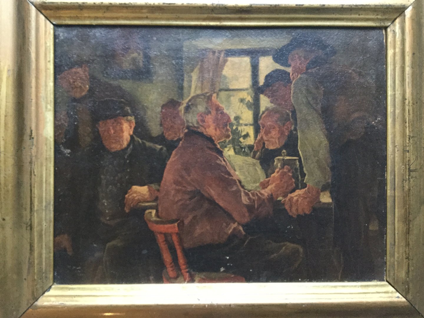 Gammelt olietryk efter maleri - Mænd i krostue.
