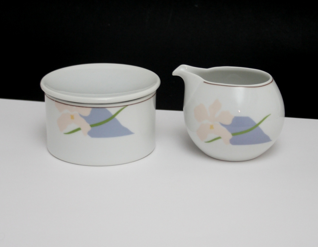 Text available in Danish: Bing & Grøndahl, Blå Orkide. Designet af Hans Christian Rasmussen. Sukkerskål med låg. Dek.nr. 302. Højde 5,5 cm. Diameter 10 cm. Flødekande. Dek.nr. 393. Højde 7 cm. Længde 9 cm. I. sortering. Pris: 425 kr. samlet. Lager: 2 sæt