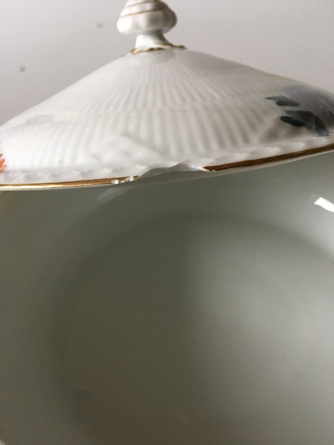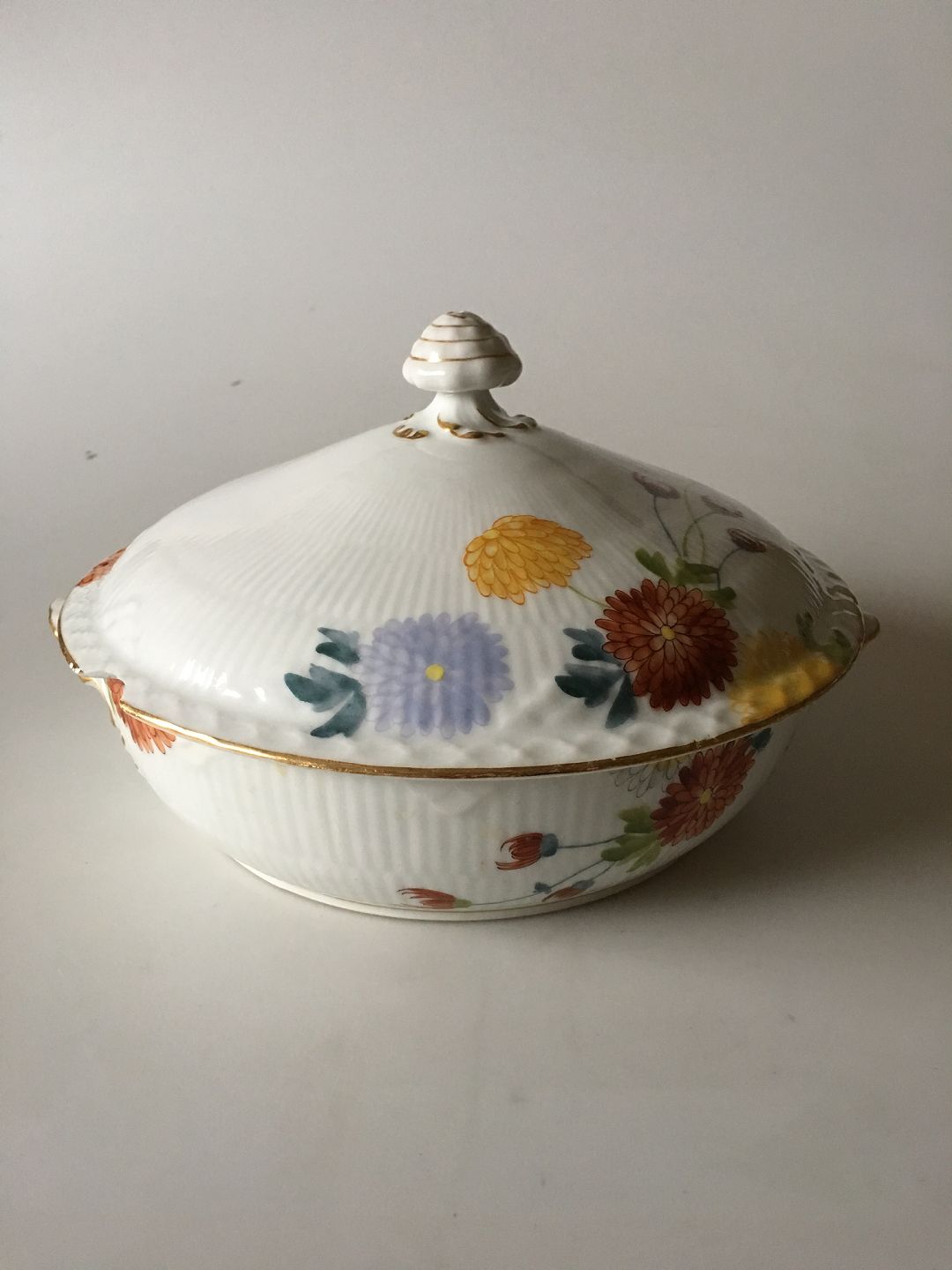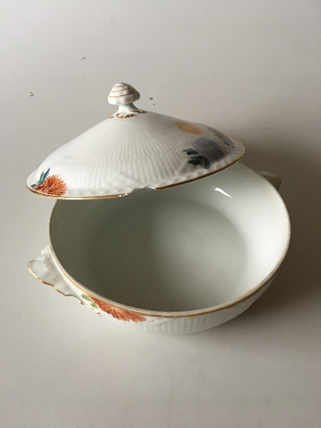 Royal Copenhagen Stel No 93 Hvid Halvblonde m. Blomster og Guldkant Ragoutfad. 20 cm Ø. 6 cm Høj. Låget har et skår, se billede. Guldkanten har lidt slid. Sjældent Porcelæn Service fra 1894-1898.