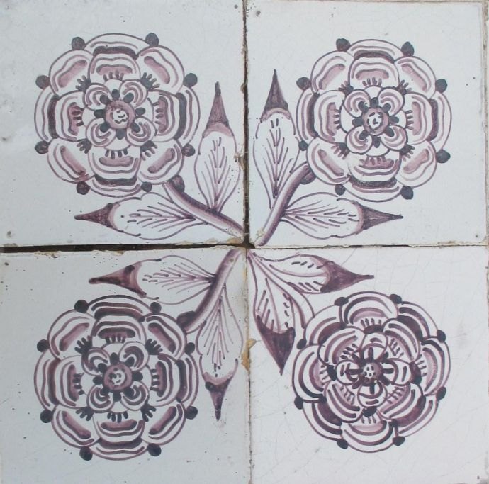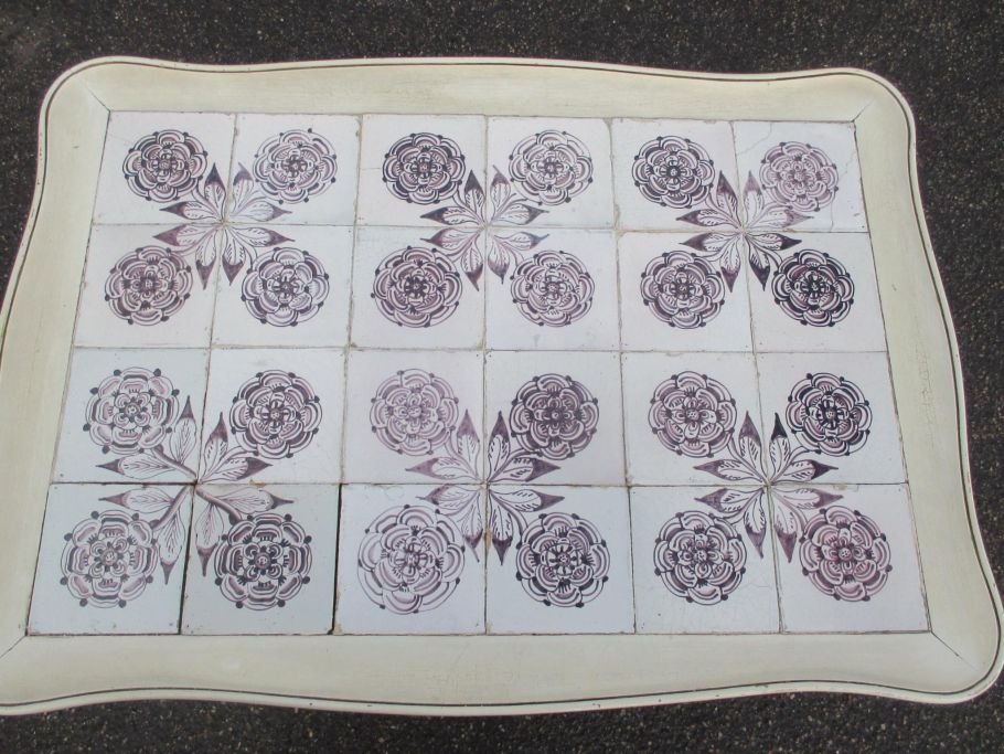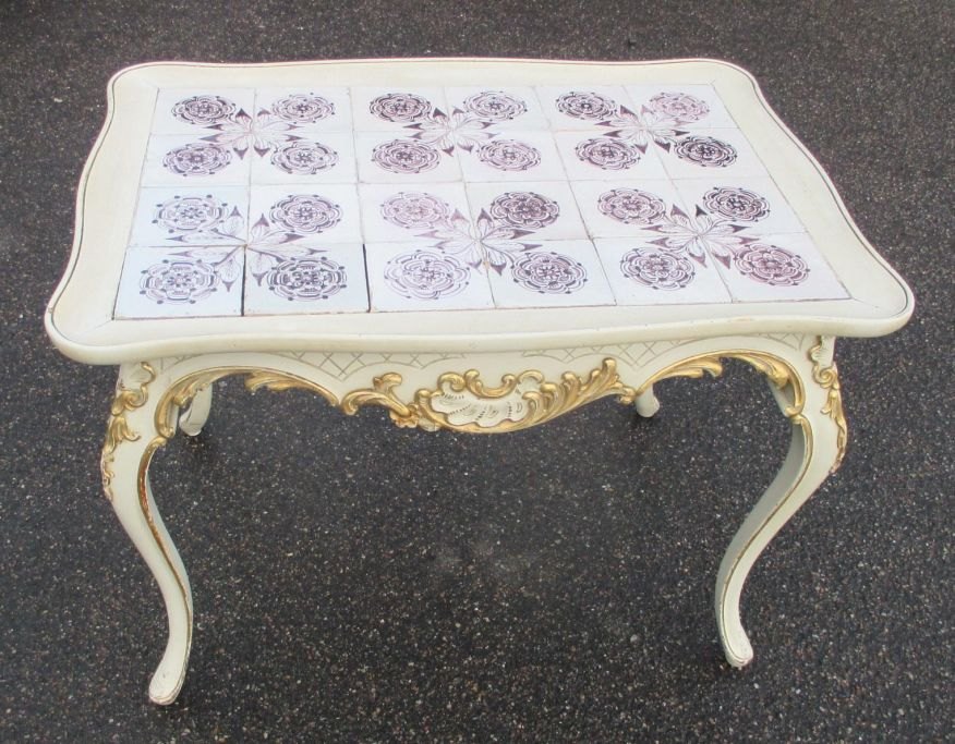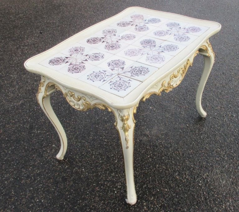 Ny rococo flisebord i hvidmalet fyrretræ med forgyldninger, Danmark, 19/20. årh. Bord med capriole ben og rococo skæringer og vaffelmønster. Med 24 nedlagte mangan farvede frisiske blomster fliser fra 1700-tallet. Harlingen. 13 x 13 cm. Enkelte af fliserne har smårevner og kanthak. Bord.: 92 x 64,5 x 67 cm. Smukt arbejde!