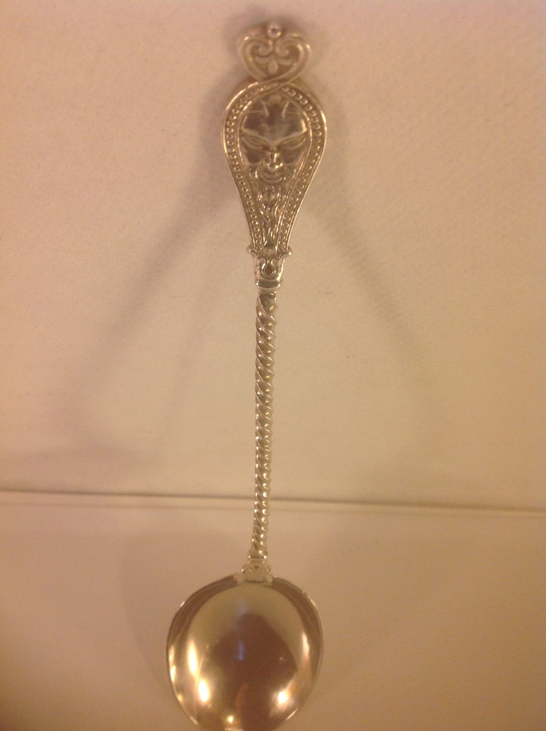 Sølv ske med maske.