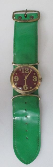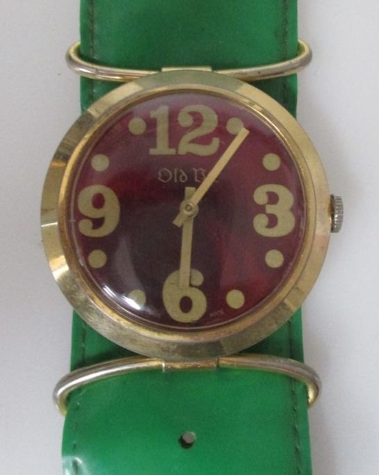 1970' armbåndsur. Af mærket Old Vic, Schweiz. Forgyldt metal kasse. Urskive af rød emalje skiv med forgyldte tal. Dia.: 4,5 cm. Med tilhørende grøn plastic rem.
