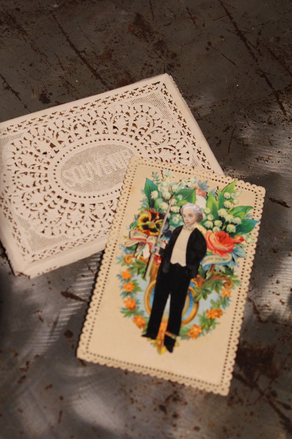 Dekorativt gammelt Fransk konfirmationskort i papir med tilhørende konvolut.