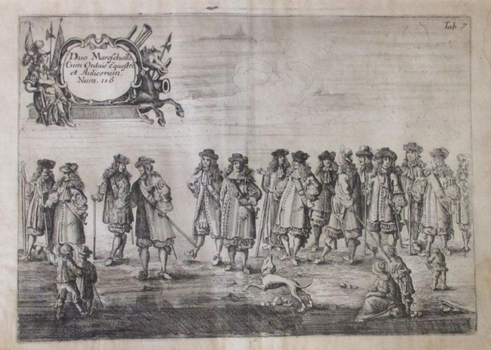 Duo Mareschalli Cum Orduie Equestri et Aulicorum, Num 116. Kobberstik fra midten af 1600-tallet. Illustration no. 7 fra bog værket: Christiano-Albertinæ Inavgvratio.