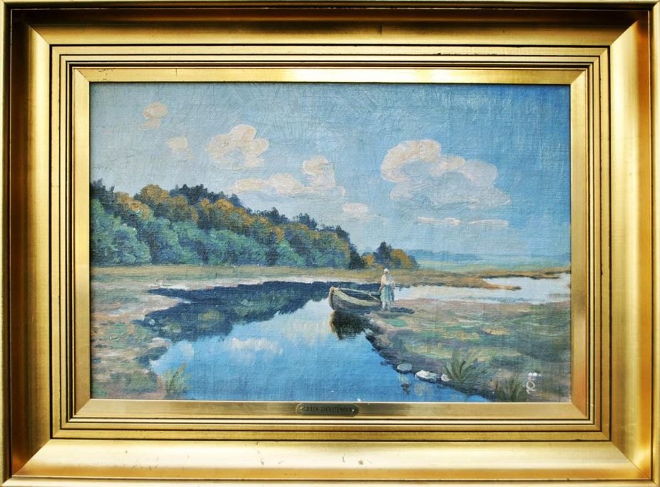 Christensen, Søren (1858 - 1937) Denmark: Woman at the river. Oil on canvas. Signed .: Monogram. 32 x 42 cm.