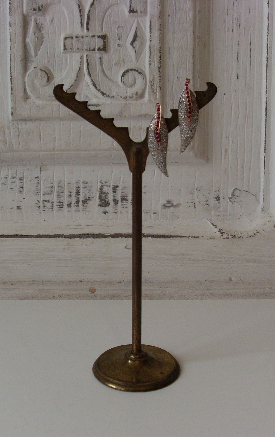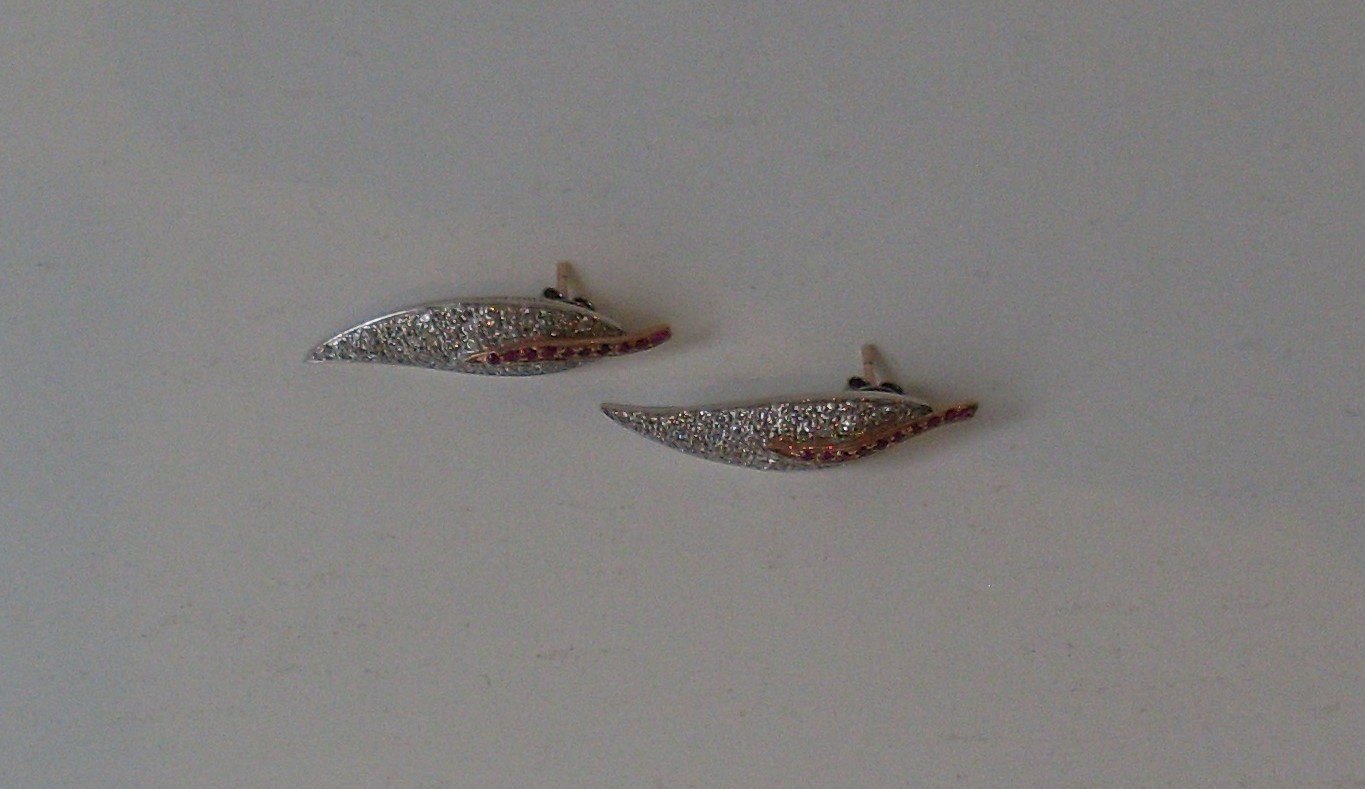 Par bladformede ørestikker i 8 kt hvidguld prydet med adskillige rubiner og diamant