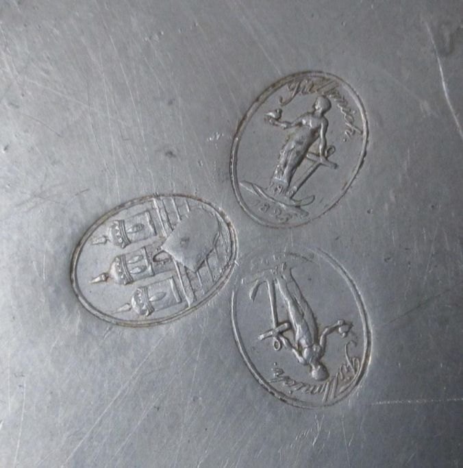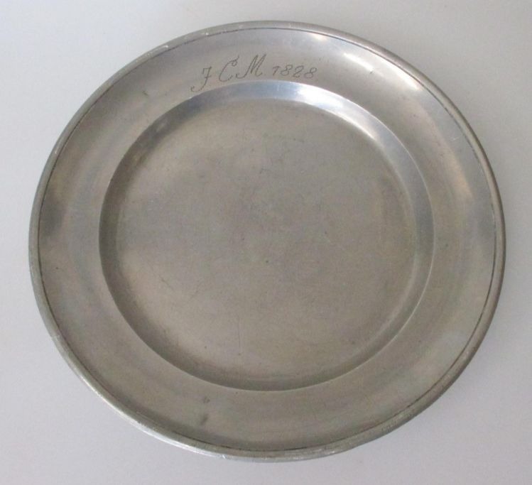 Tin tallerken, 1825, med bystempel og mestermærke. Dia.: 21,4 cm. Stemplet. På rand initialer: J. C. M. 1828.