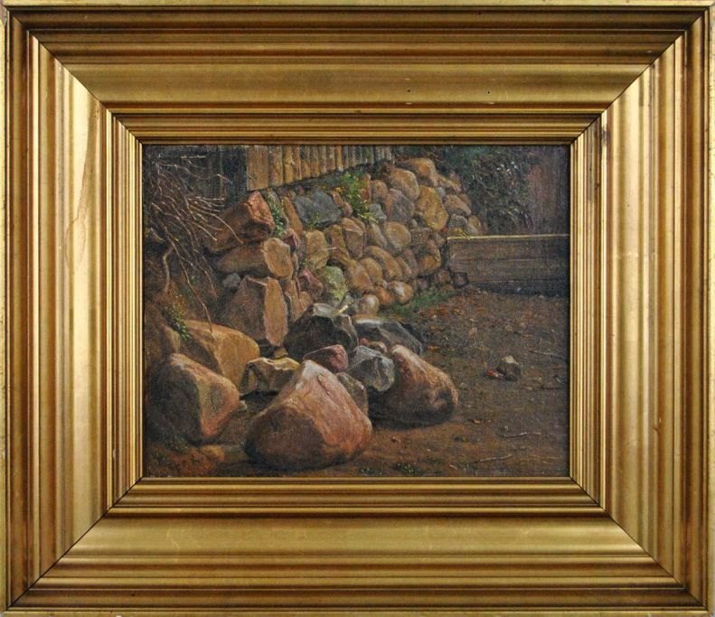 Kiærschou, Frederik Christian (1805 - 1891) Denmark: A stone wall. Oil on paper / glued on cardboard. Signed: FCK 1870. 20 x 25 cm.