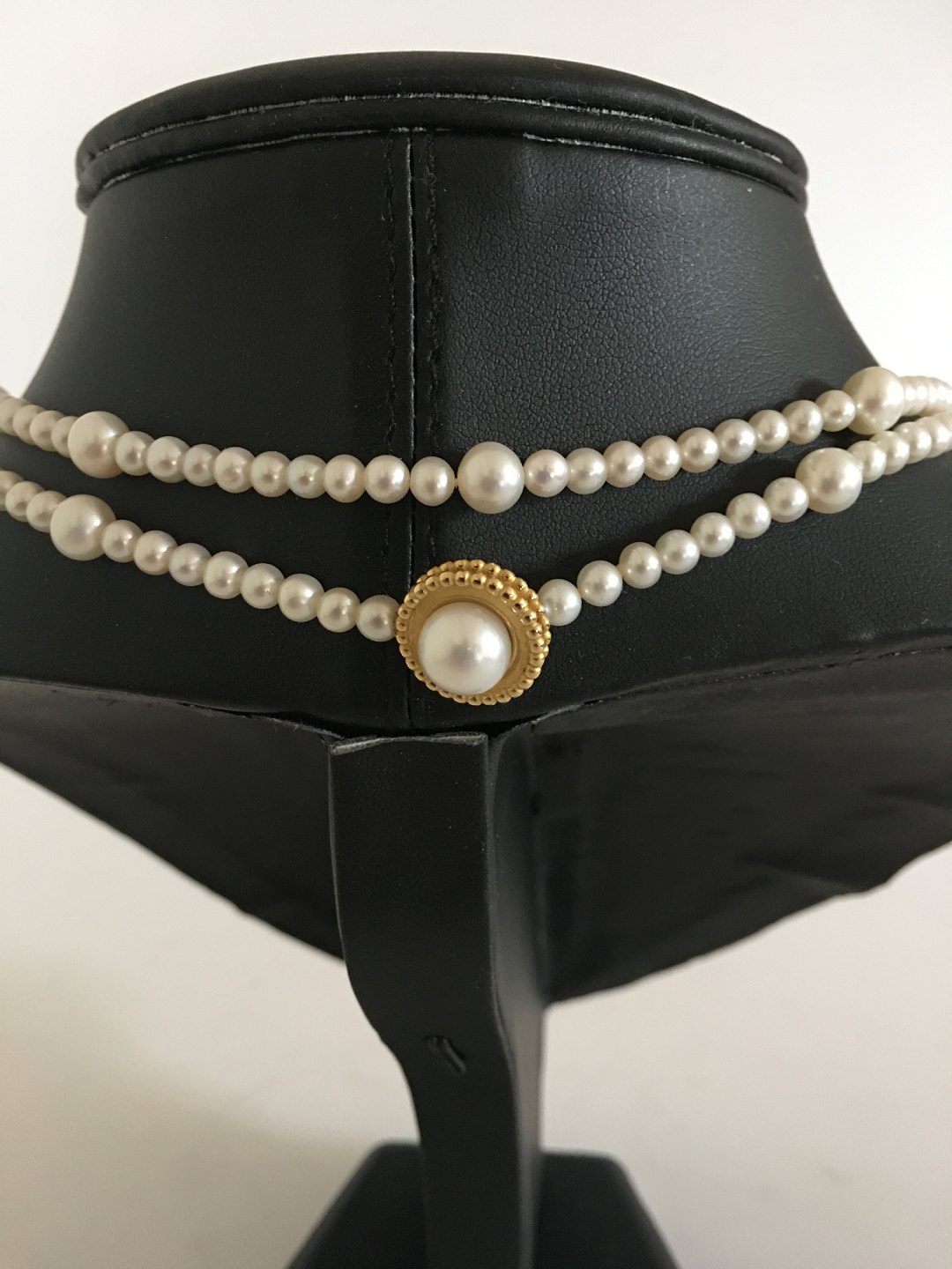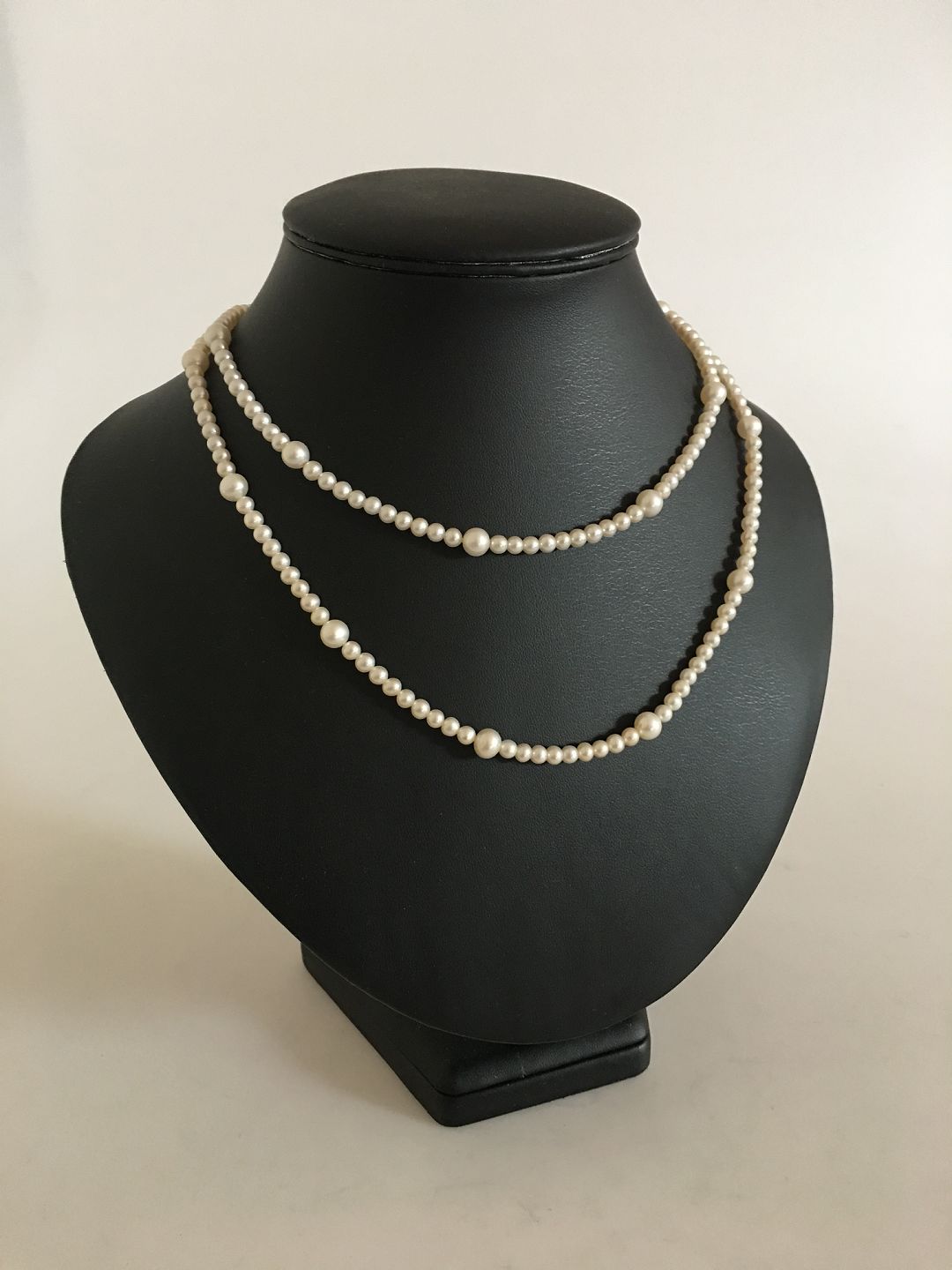 Georg Jensen Collier med Hvide Ferskvandskulturperler og Guldlukning. 88 cm L. Kuglerunde perler i flot stand. Flere styling muligheder. Perlerne er 4mm og de store 7mm