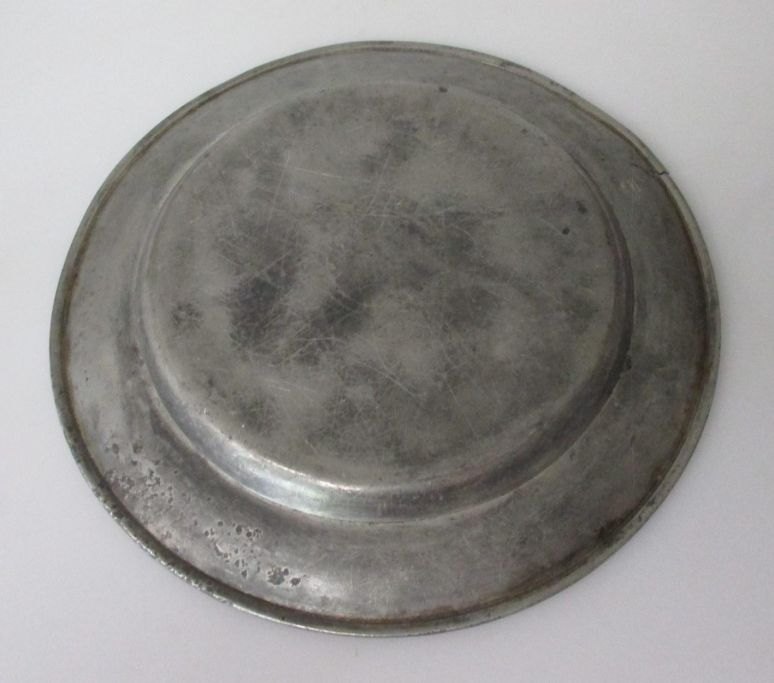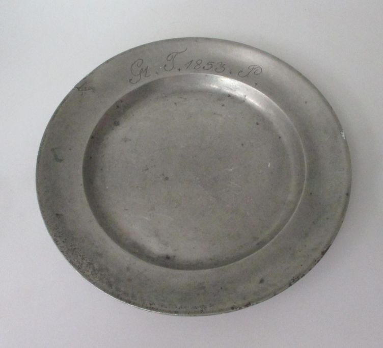 Tin tallerken 1853. Dia.: 22,5 cm. Med inskription på kanten: G + F + 1853 + P +. Uden mestermærke.