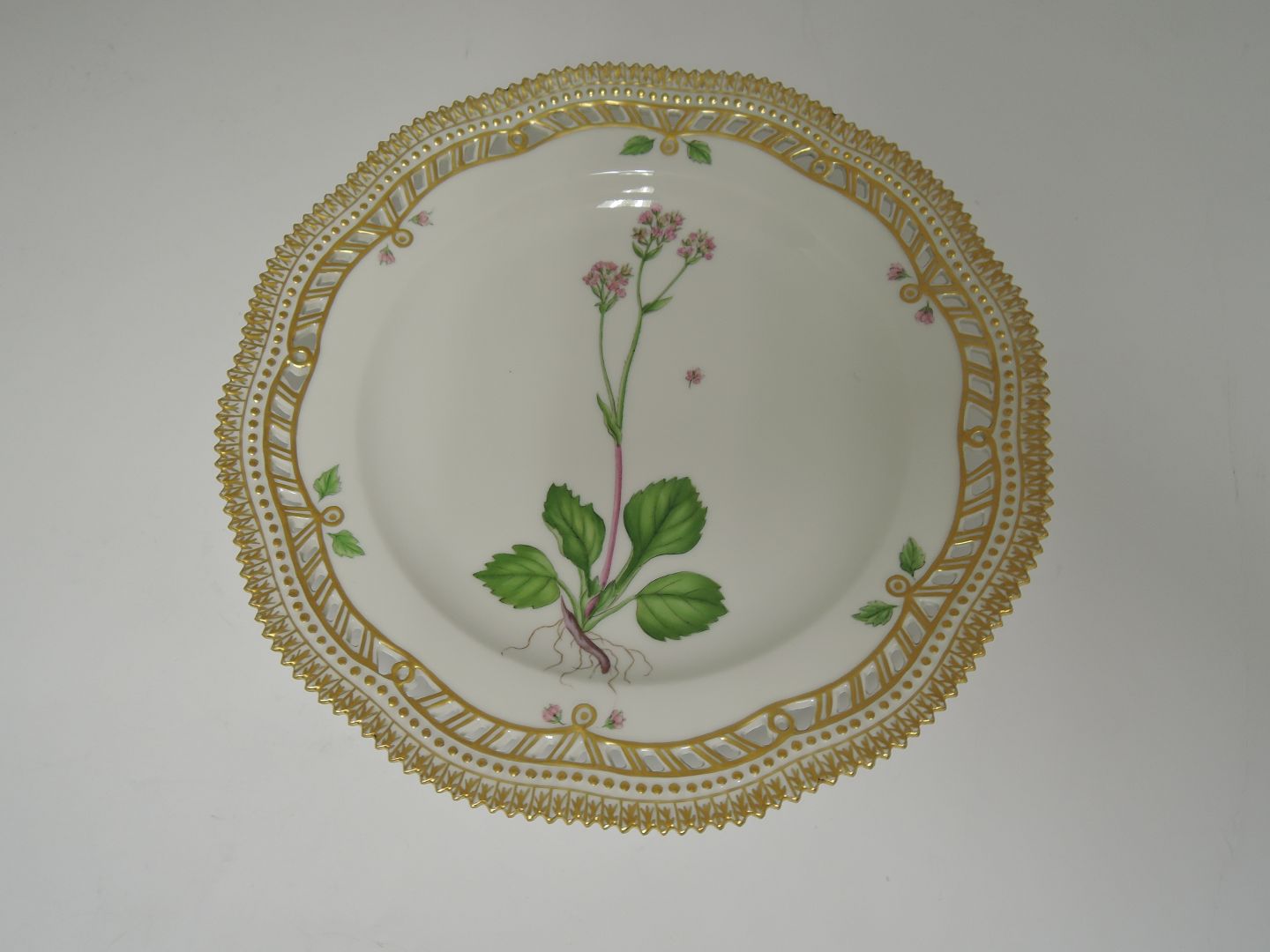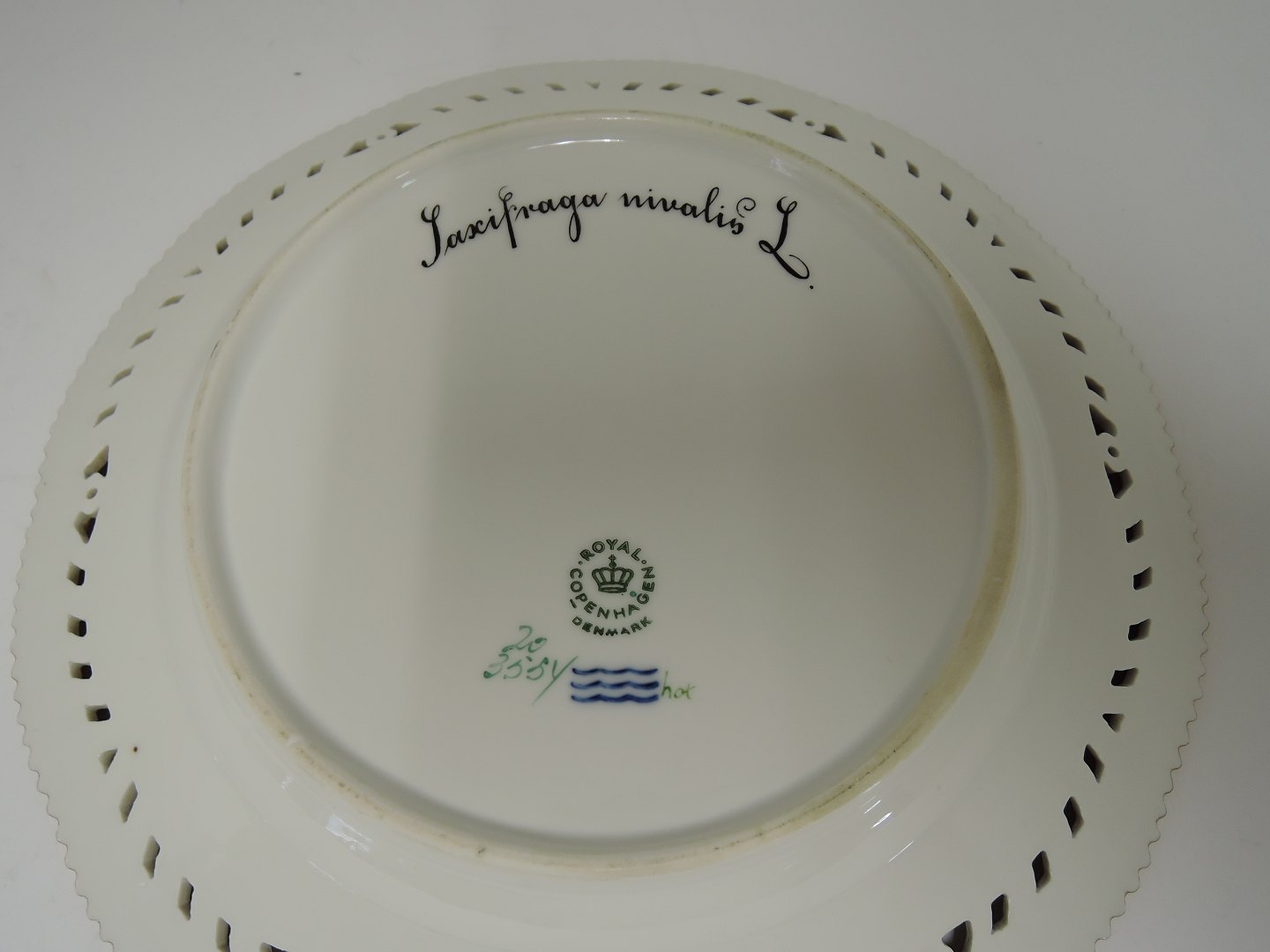 Royal Copenhagen, Flora Danica. Frokost tallerken med gennemskåret bort. Design #3554. Diameter 23 cm. (1 sortering) Saxifraga nivalis L