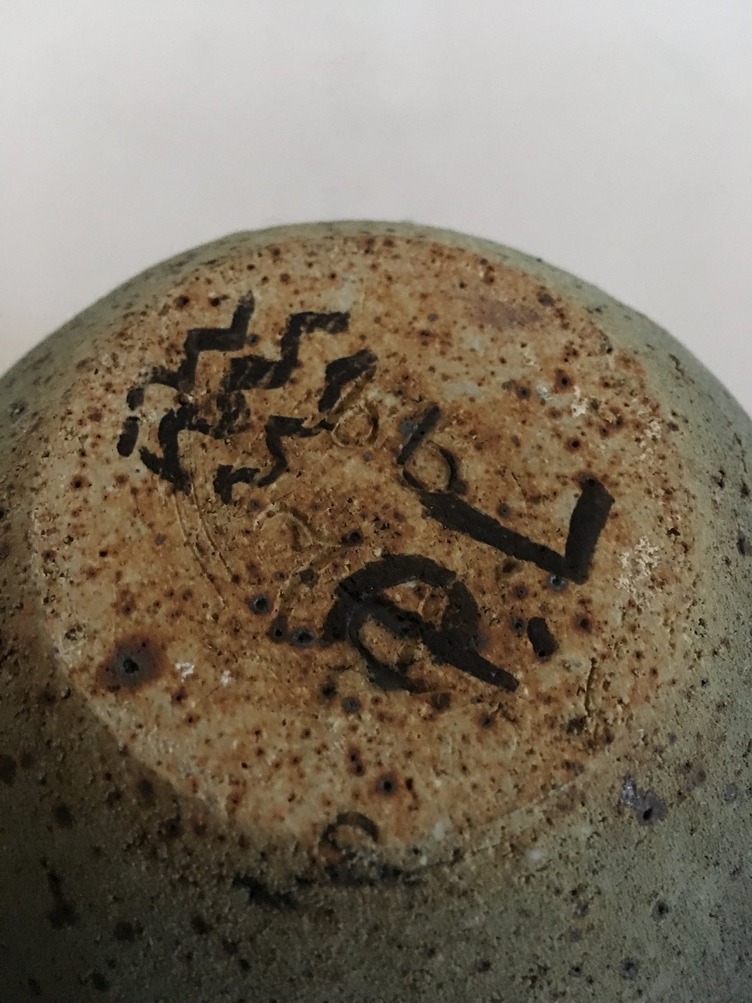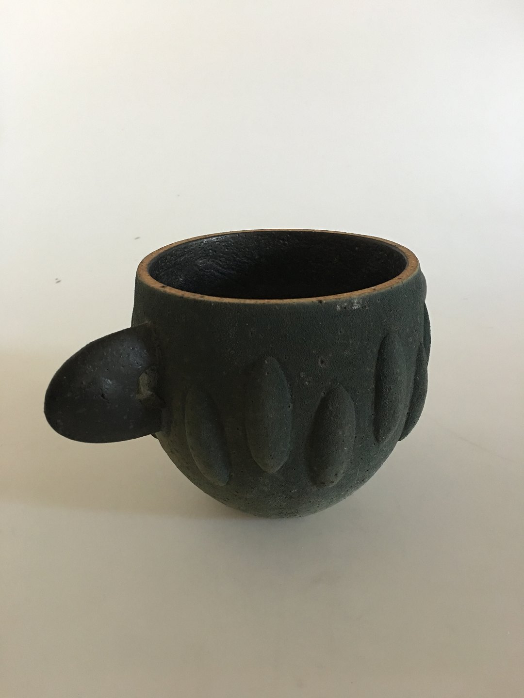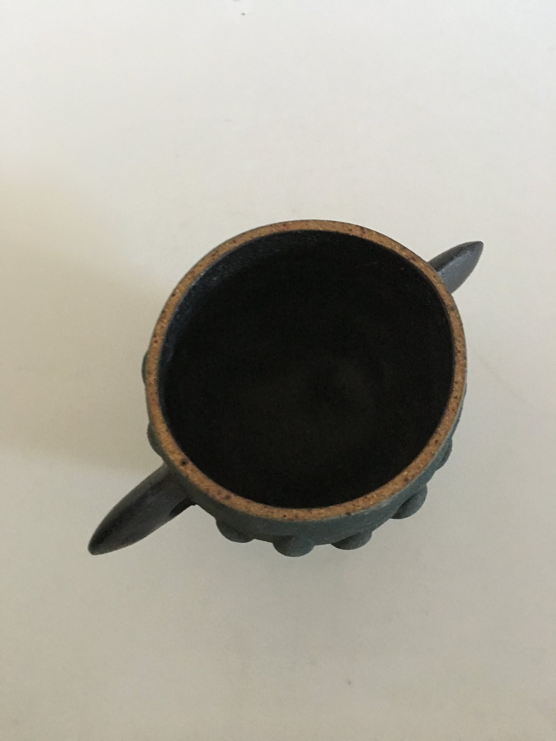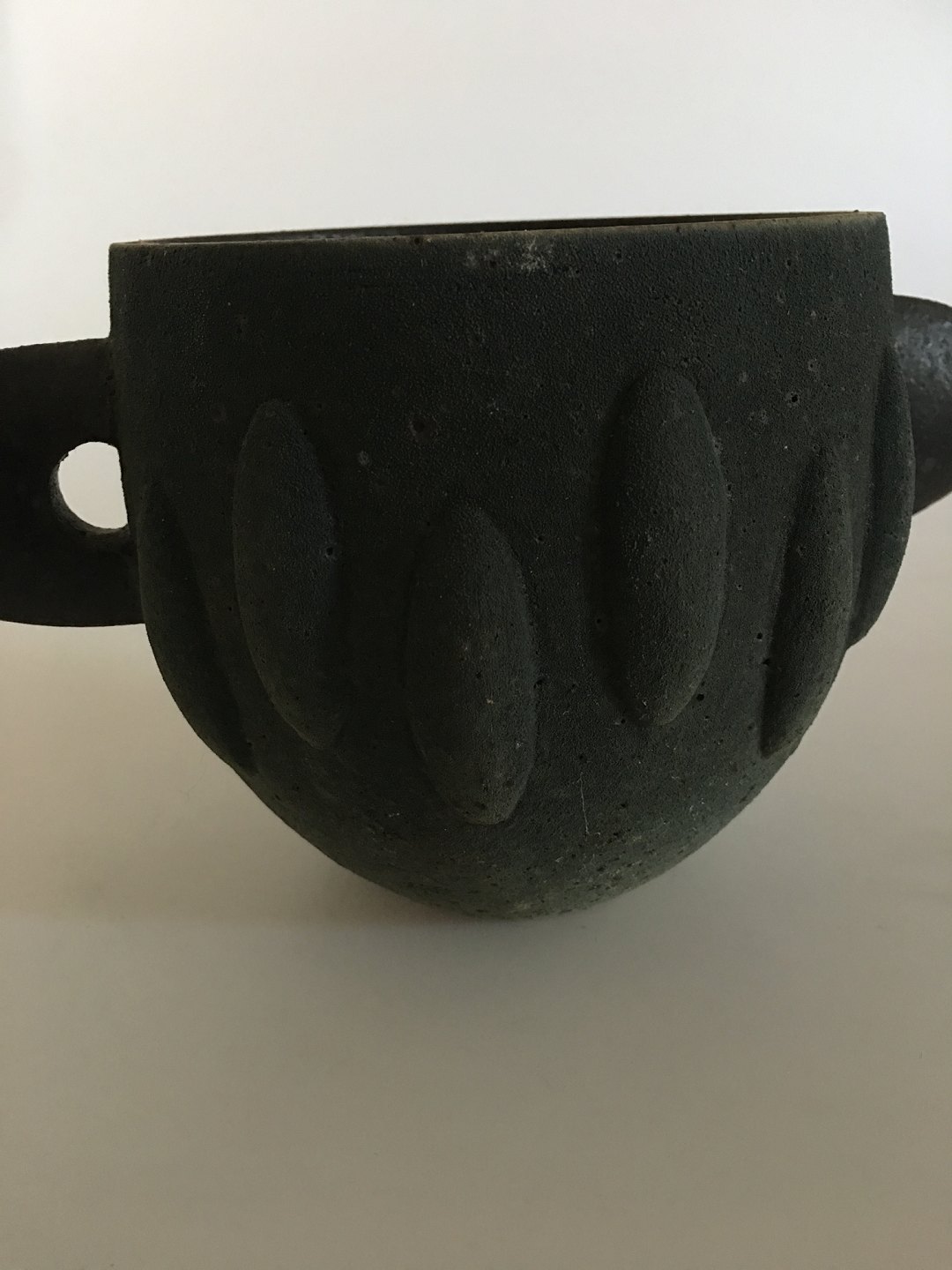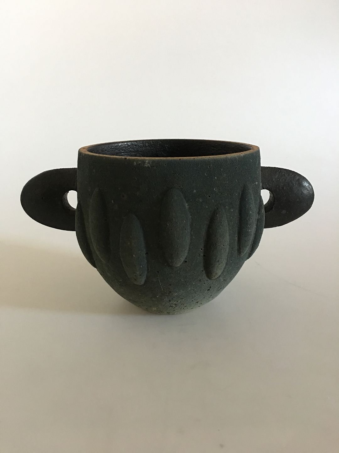 Royal Copenhagen Unika Stentøjsvase af Pia Langelund. Moderne to hanket vase med flot ru mørkgrønlig overflade. Vasen er 12.5 cm Høj. 13 cm Ø.