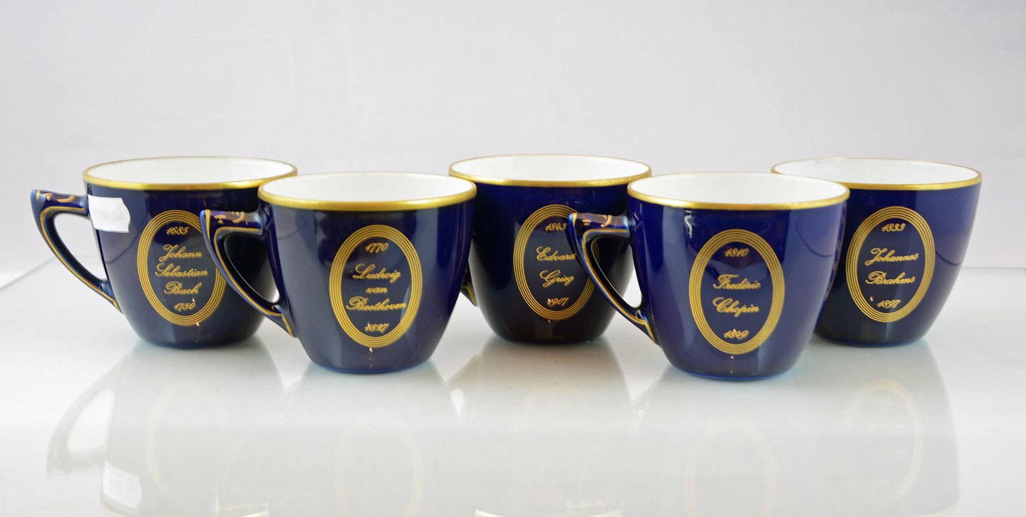 Kaffestellet Komponist fra Bing og Grøndahl. Blåt porcelæn med forgyldte silhuetter og skrift.