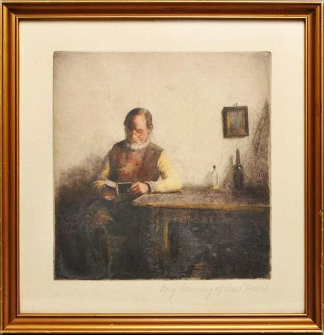Ilsted, Peter (1861 - 1933) Danmark: En læsende mand. Håndkoloreret messotinte. Original radering af Peter Ilsted. 25,5 x 24,5 cm.