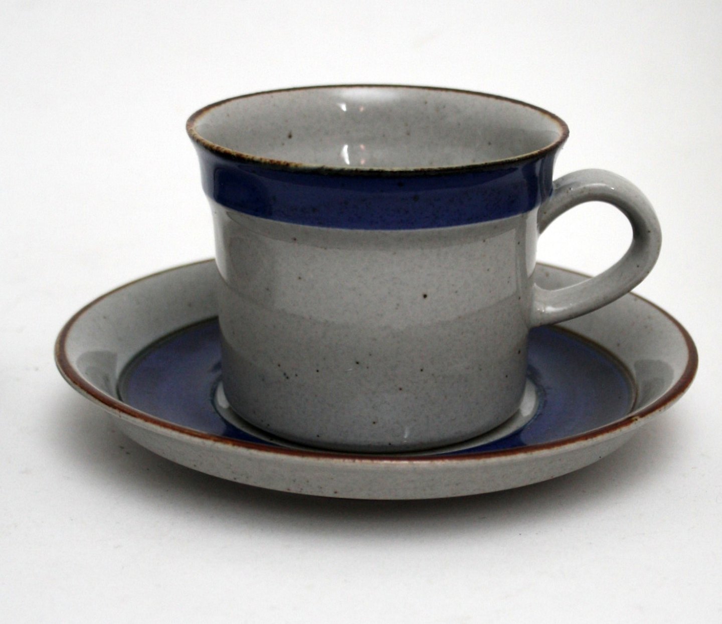 Text available in Danish: Knabstrup, Christine stentøjsstel grå glasur med blå kant. Designet af den tyske kunstner Christine Konschak, som var tilknyttet Knabstrup i perioden 1967-1970.