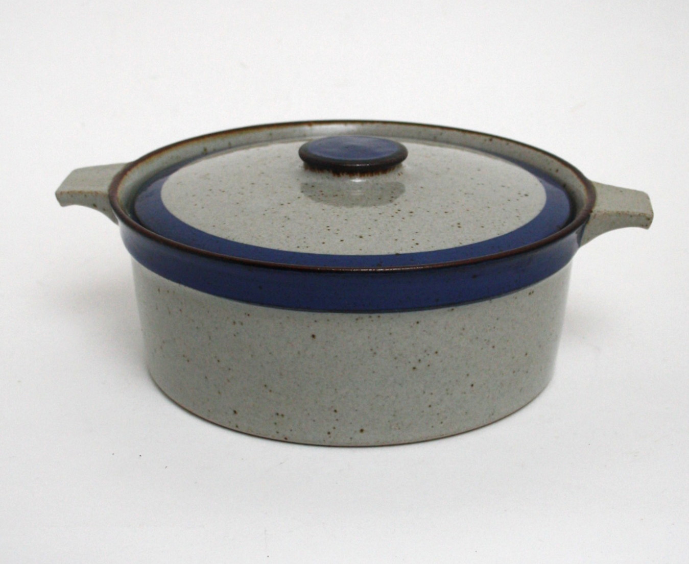 Text available in Danish: Knabstrup, Christine stentøjsstel grå glasur med blå kant. Designet af den tyske kunstner Christine Konschak, som var tilknyttet Knabstrup i perioden 1967-1970.