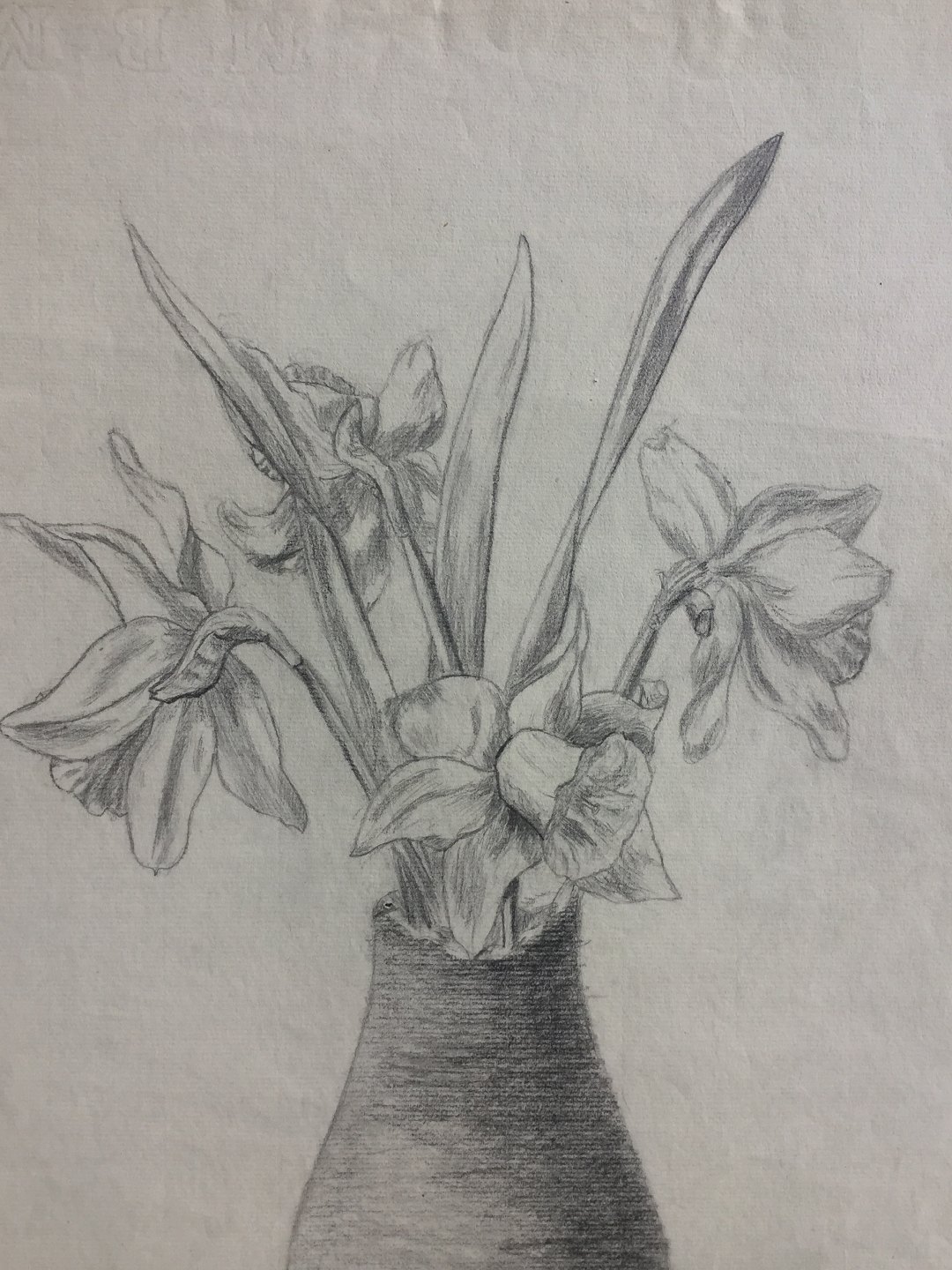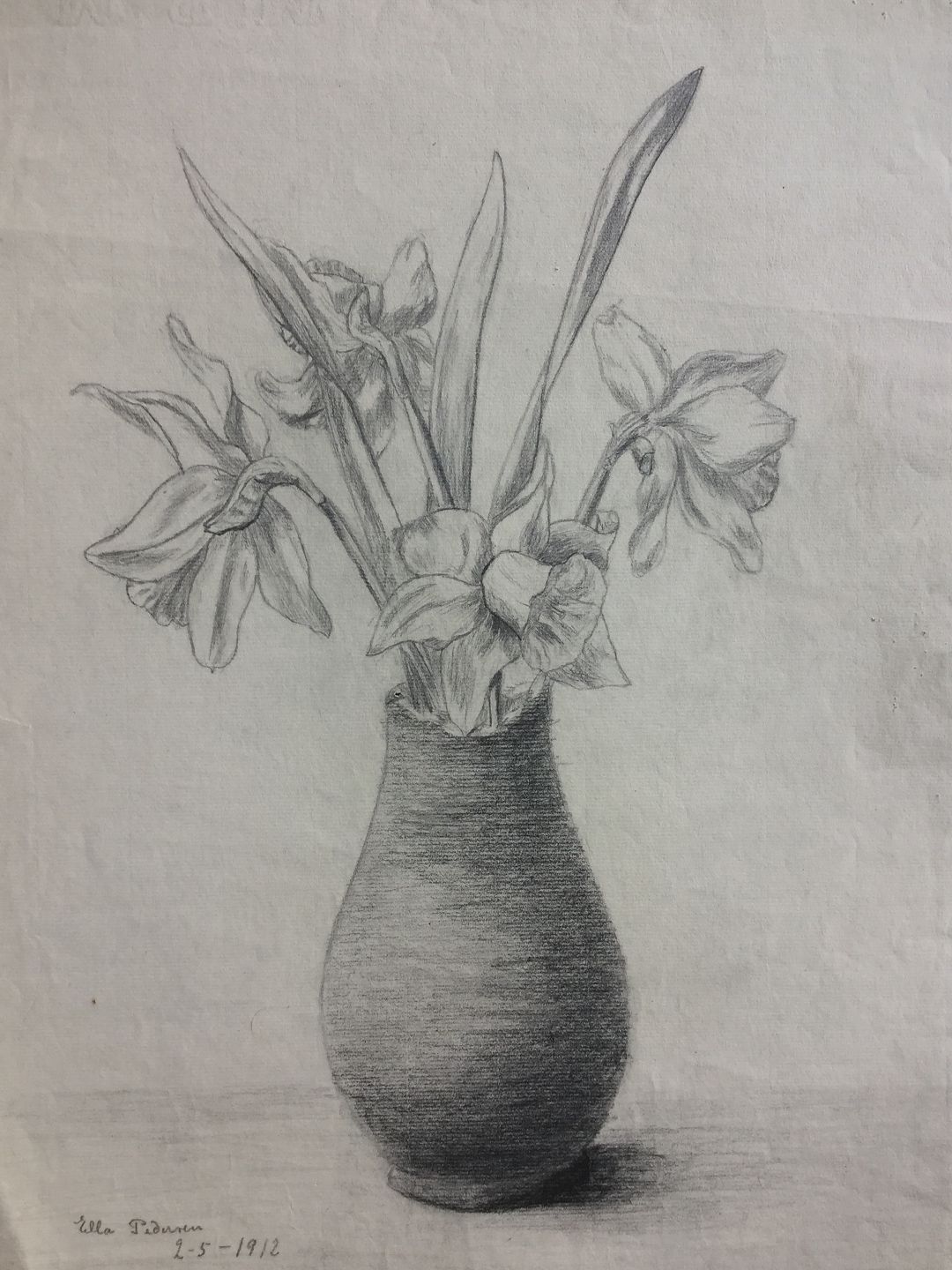 Text available in Danish: Tegning af Ella Pedersen 1912 - vase med påskeliljer.