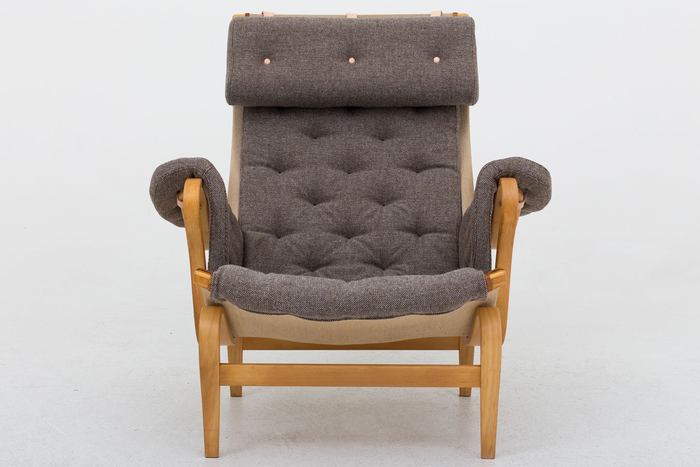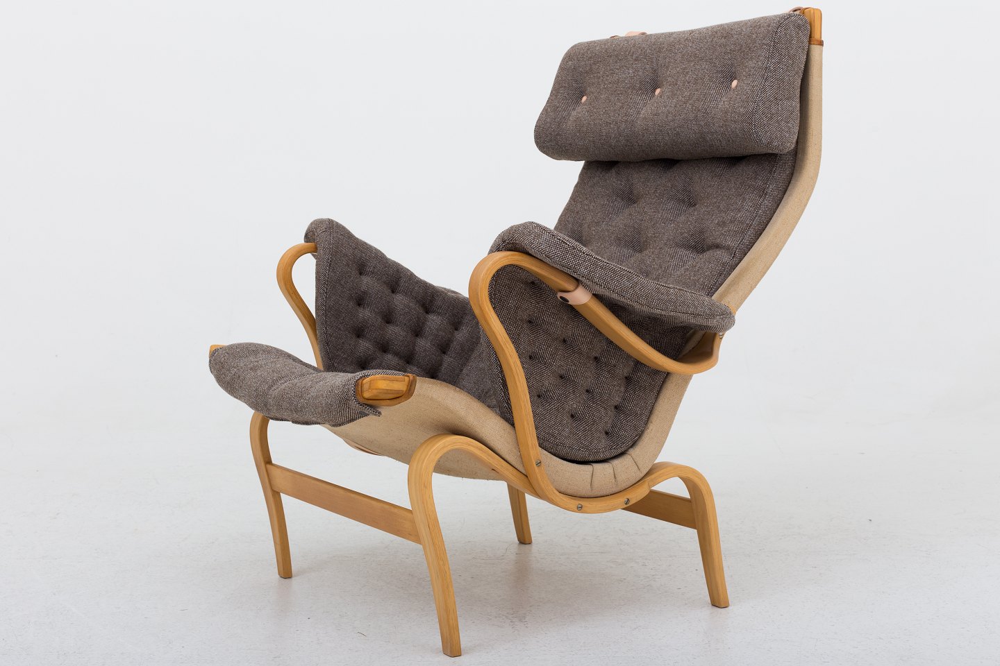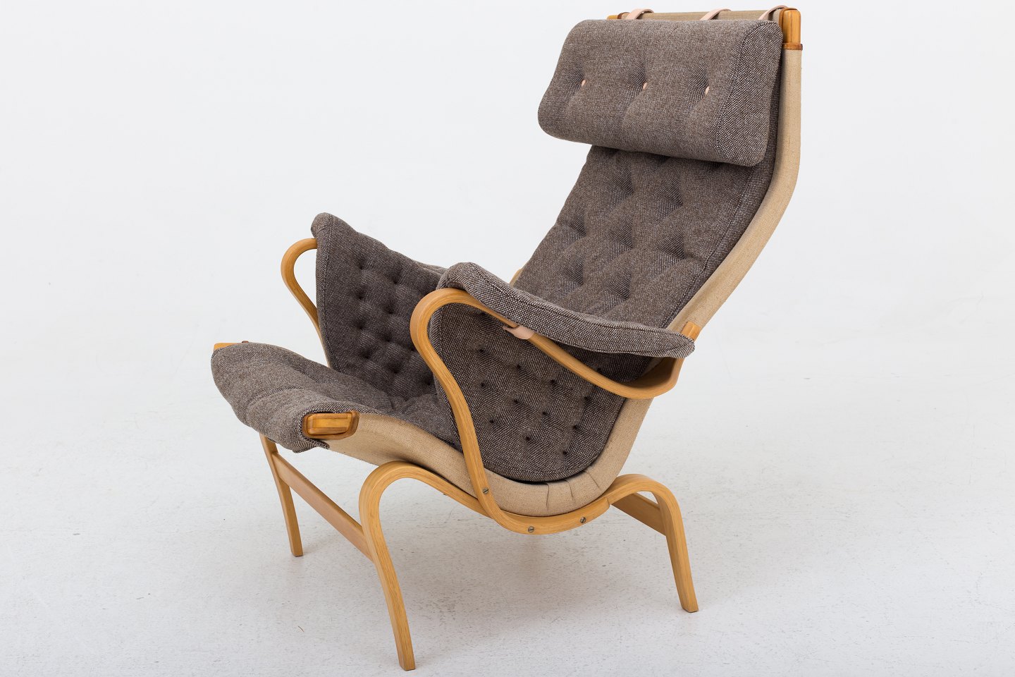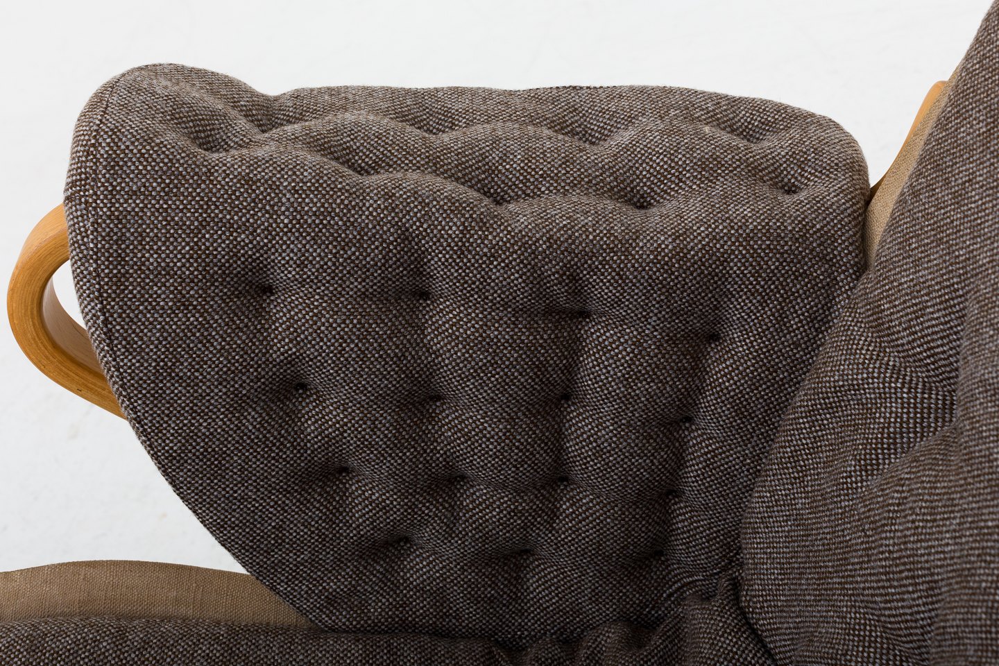Pernilla 69 - Nybetrukket lænestol i Hallingdal 65 (code 270) og vegetallæder-knapper i nakkehynde. Stel i bøg