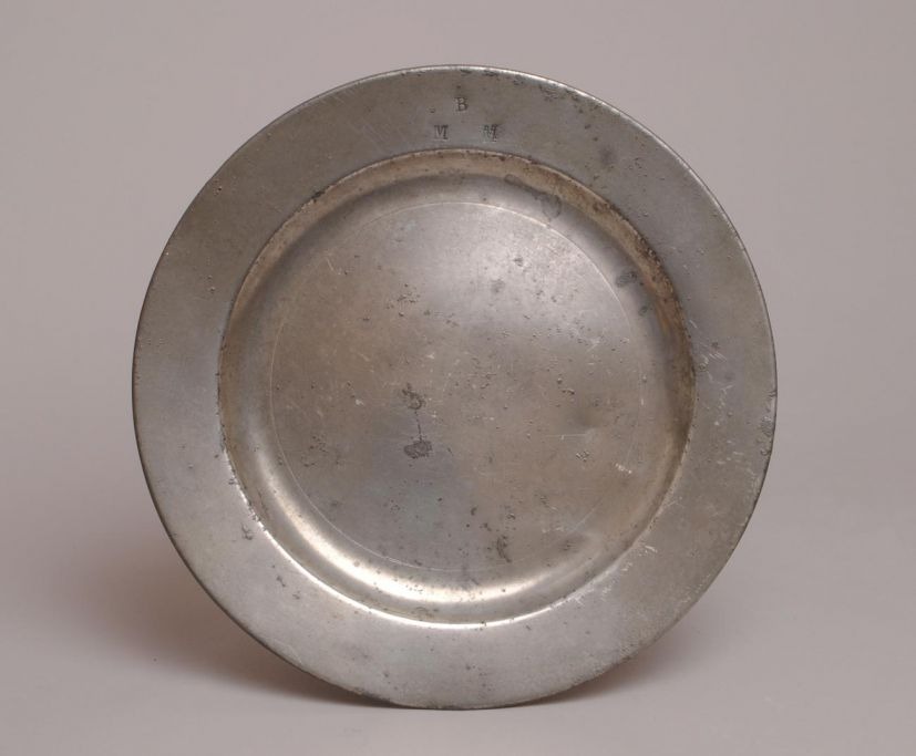 Tin tallerken, 18. årh. England. Mærket: B M M. Utydelig mestermærker på bagsiden. Dia.: 22,5 cm.