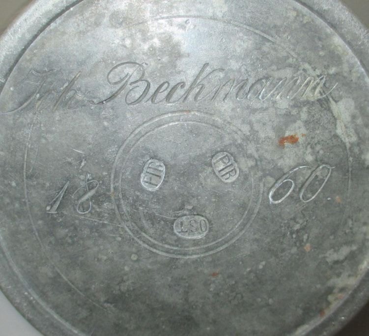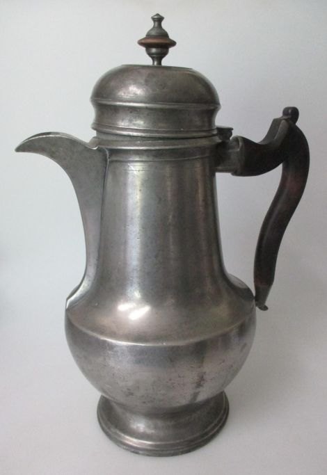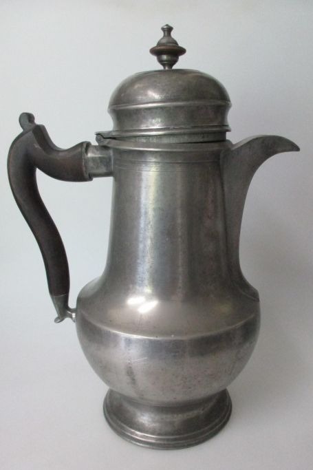 German antique coffee pot in pewter, 19th century. Smooth corpus. With wooden handle. Stamped: PIR - OST. At the bottom with engraving: Joh. Beckmann. Height: 30 cm.