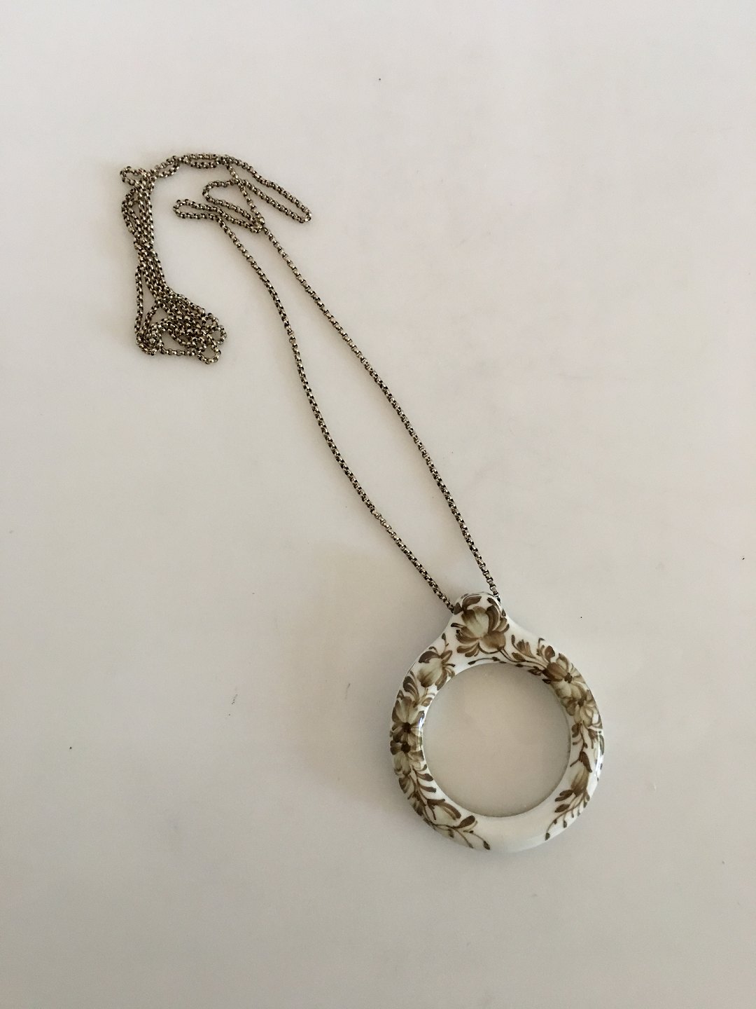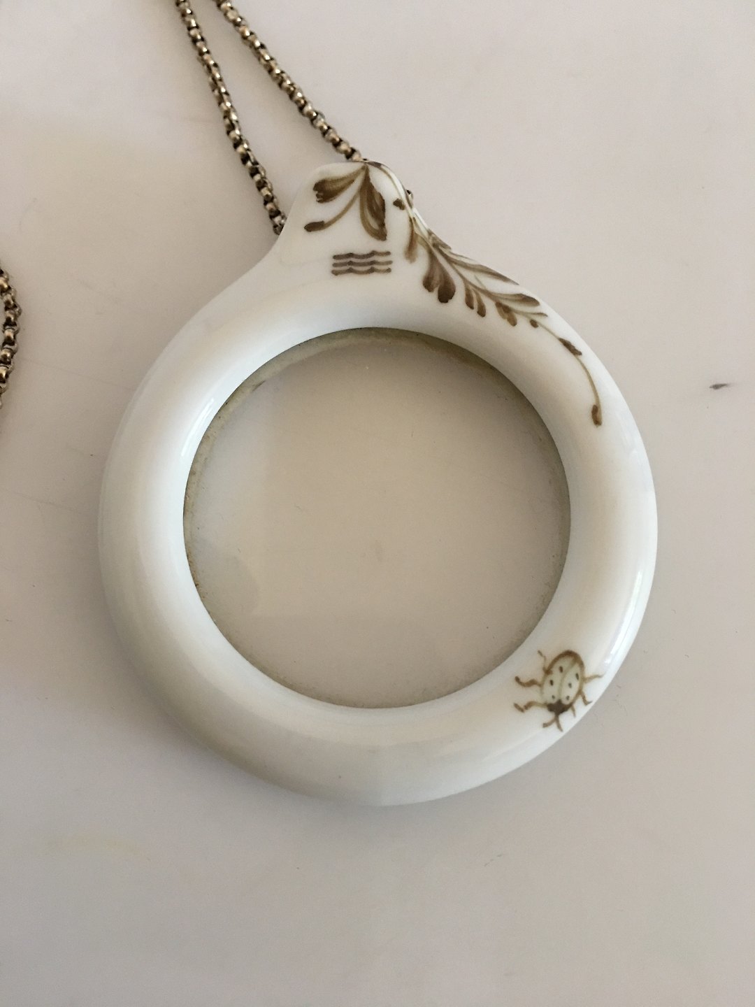 Royal Copenhagen Porcelæns vedhæng med Forstørrelsesglas / Lup. Måler 5.6 cm diameter. Kæden måler 94 cm L. Vejer 58 gram.