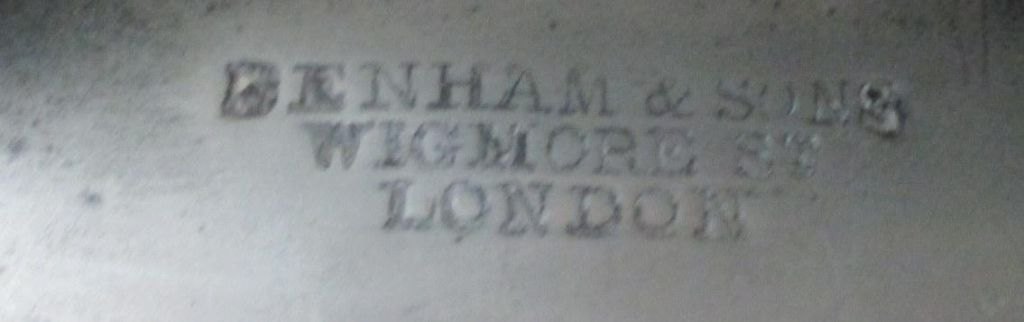 Cylindrisk is beholder med hank, tin, 19. årh. England. På låg stemplet.: Benham & Sons, Wigmore Street, London. Højde.: 28 cm.
