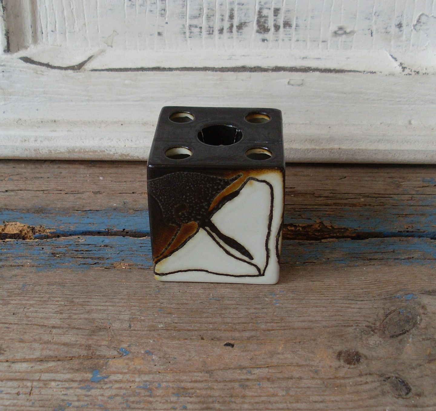 Det er både en stage og en buketholder, man kan sætte enkelt stilke af blomster i de små huller omkring lyset.