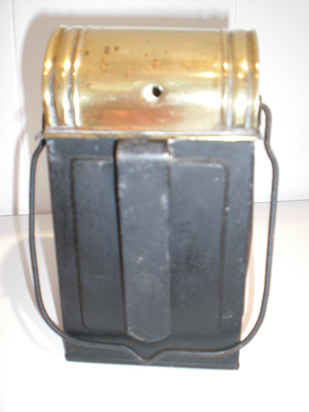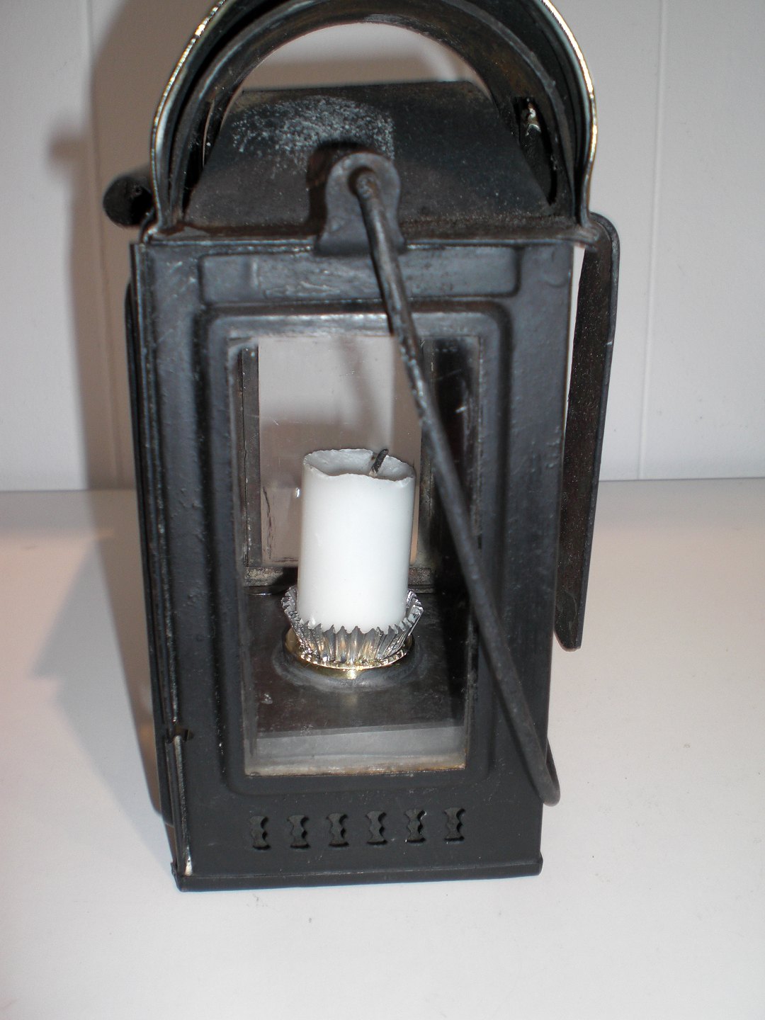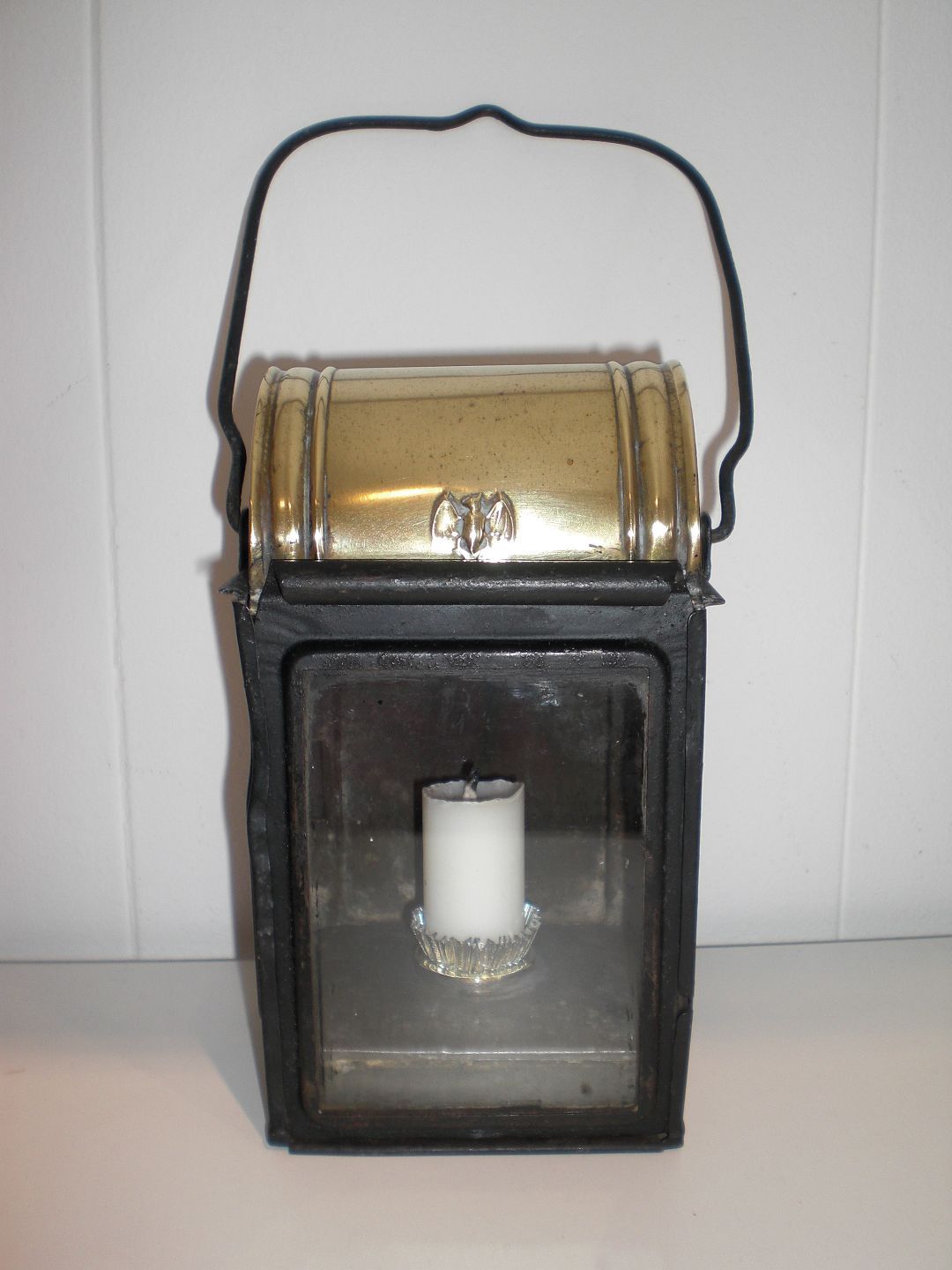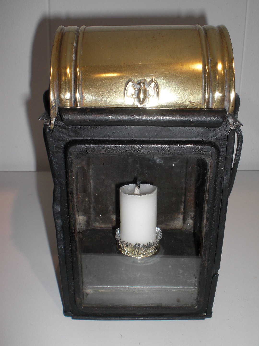 Lille dansk jernbanelygte (omlavet til stearinlys i stedet for petroleum) ca. 1900. Med flagermusdekoration på messingtop - øvrige materiale jern. Højde: 17 cm. Bredde: 9,2 cm. Dybde: 7,5 cm