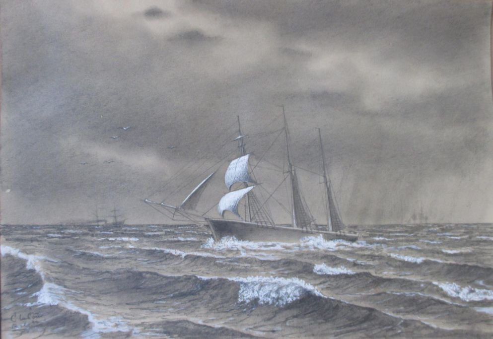 Dansk kunstner (19. årh.): Sejlskibe på havet. Bly på papir. Signeret.: C. la Cour 12-1-82. 16 x 21,5 cm.  Med træramme.