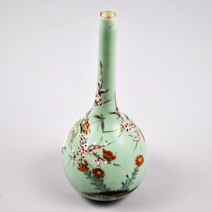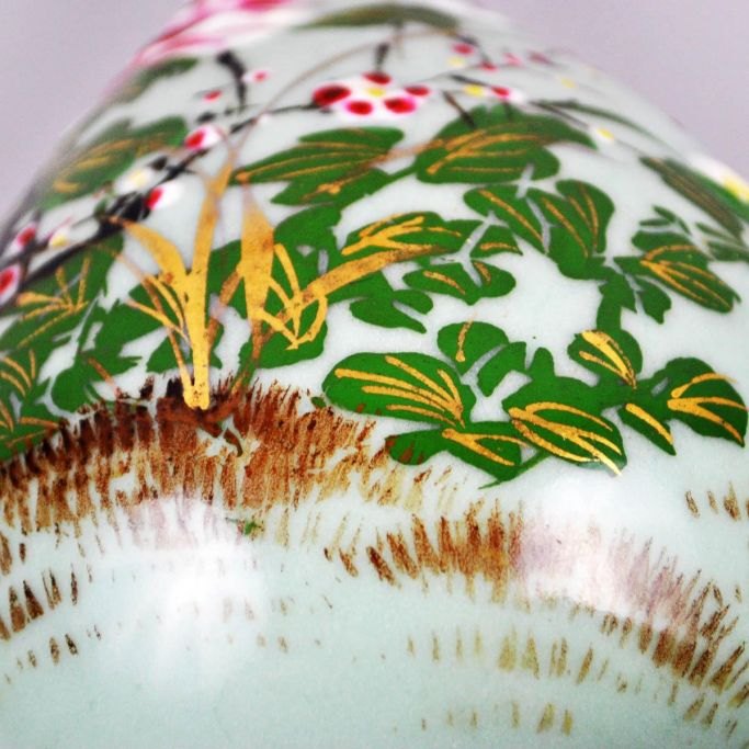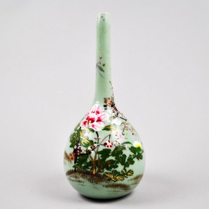 Japanese porcelain vase. app. 1900. Light green overglaze with hand paintings of flowers. With gildings. H: 25 cm.
